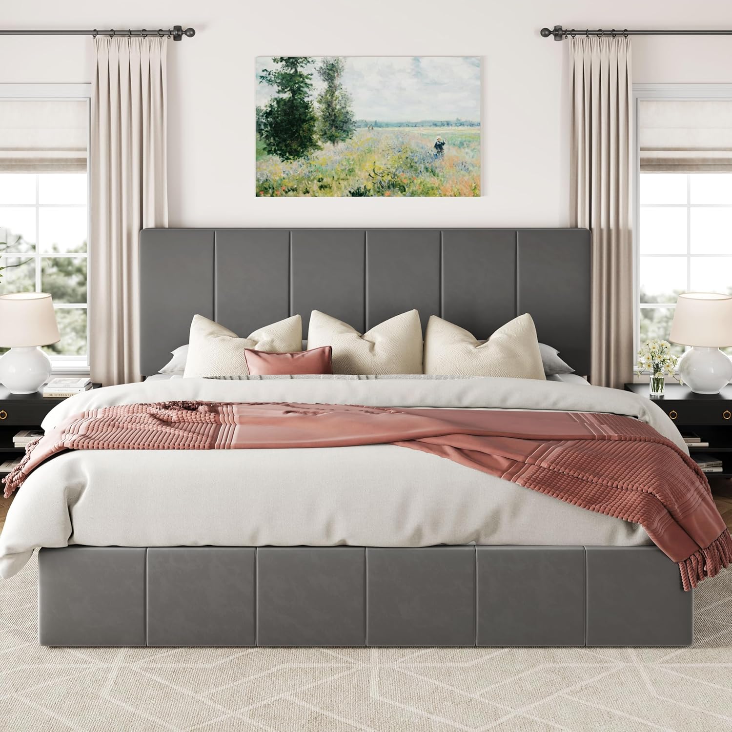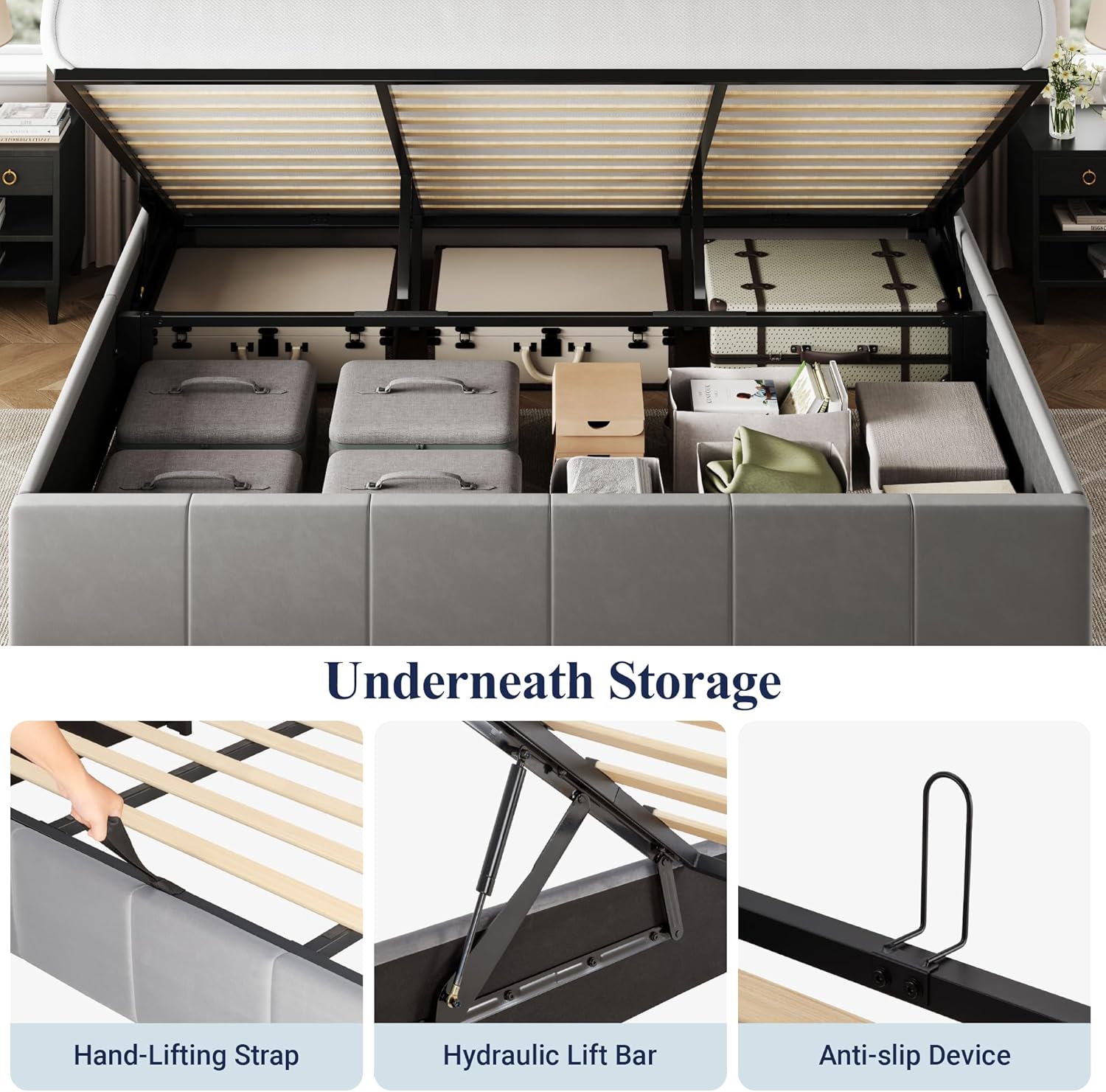 • Spacious Hidden Storage: Easily lift the platform with a smooth hydraulic mechanism to get a large under-bed storage area, perfect for storing bedding, clothes, or seasonal items while keeping your space organized and clean
