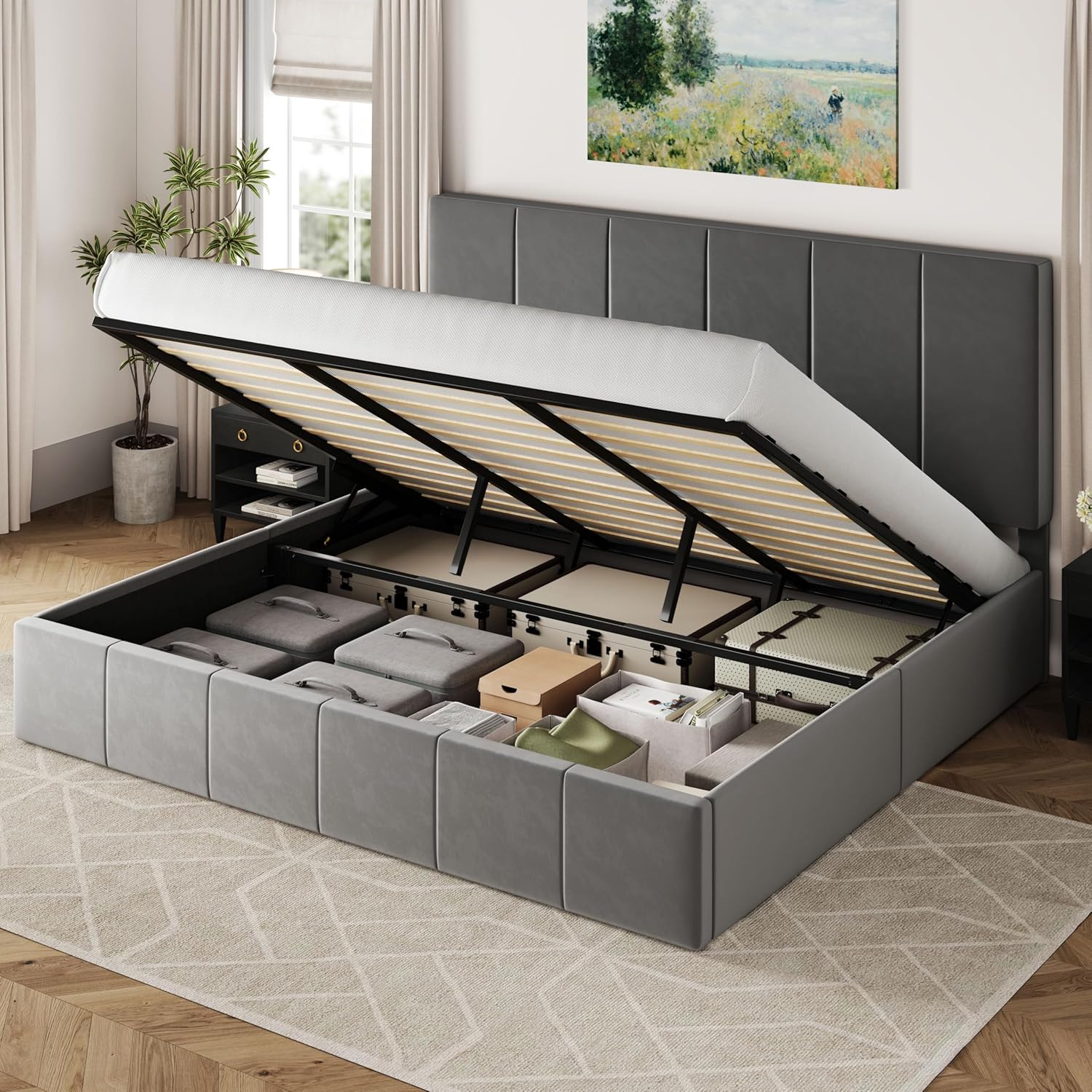 Allewie King Size Velvet Lift Up Storage Bed Frame, Vertical Channel Tufted Headboard, Hydrualic Underneath Storage, Upholstered Platform Bed, Wooden Slats Support, No Box Spring Needed, Gray