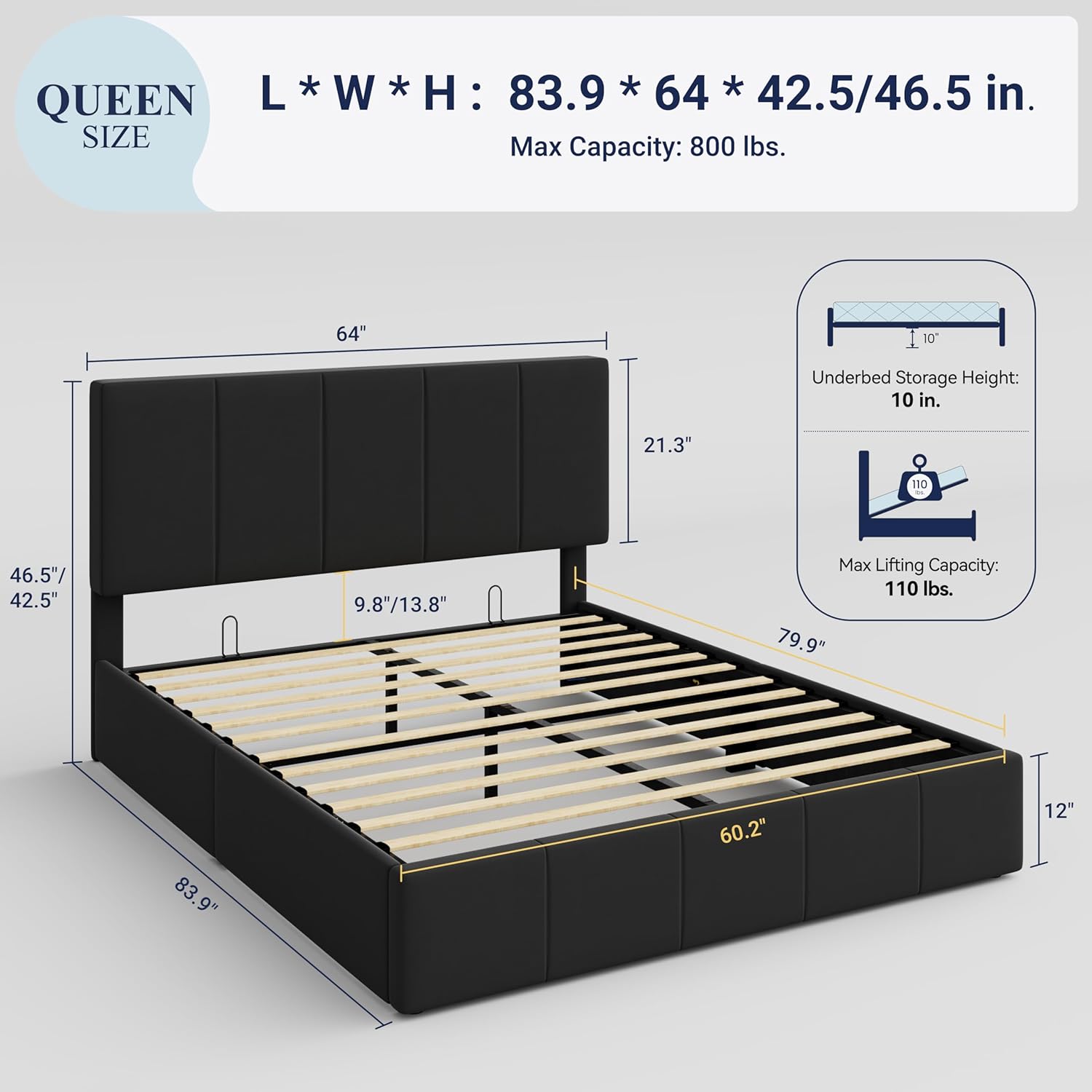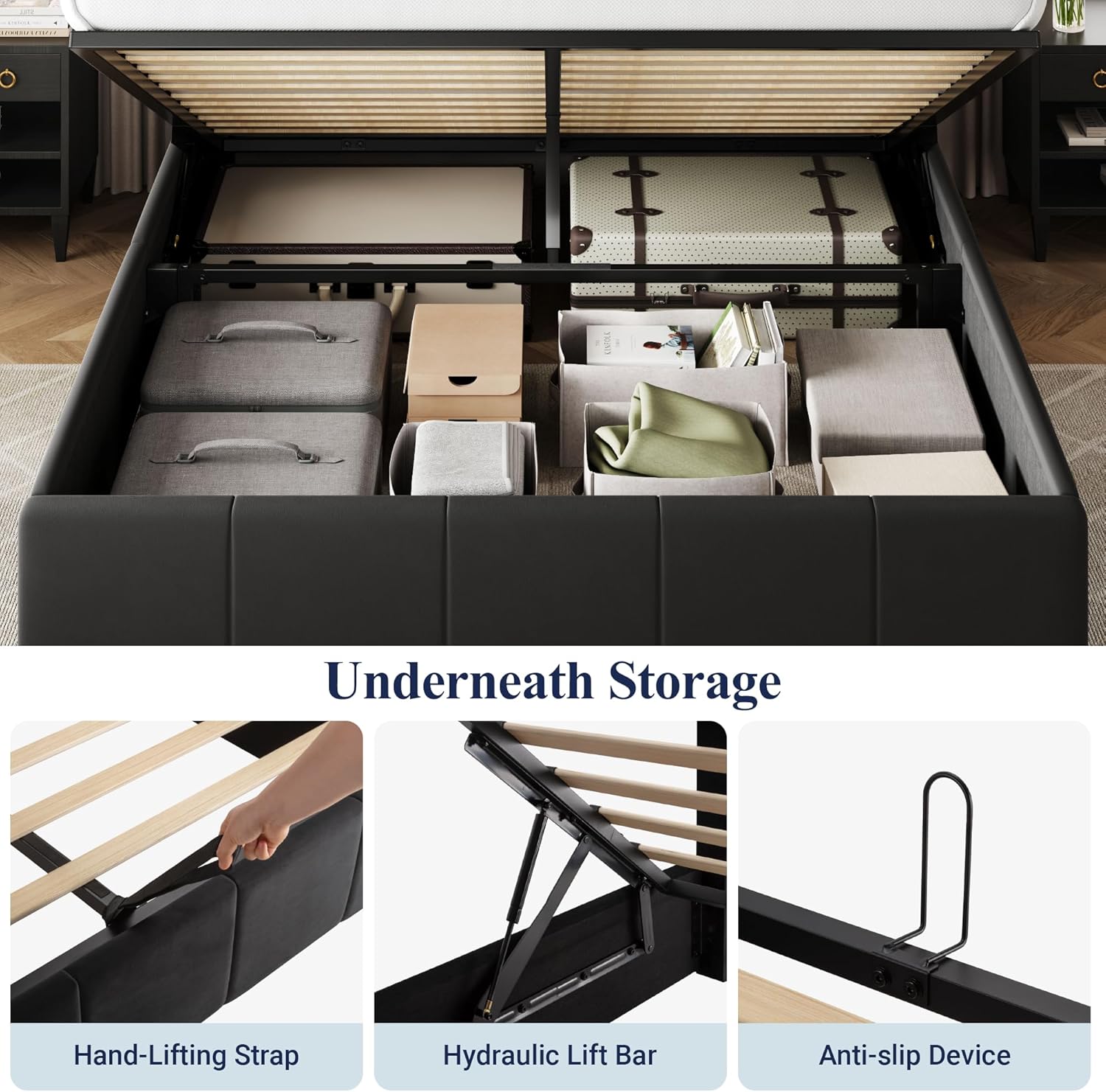 • Spacious Hidden Storage: Easily lift the platform with a smooth hydraulic mechanism to get a large under-bed storage area, perfect for storing bedding, clothes, or seasonal items while keeping your space organized and clean