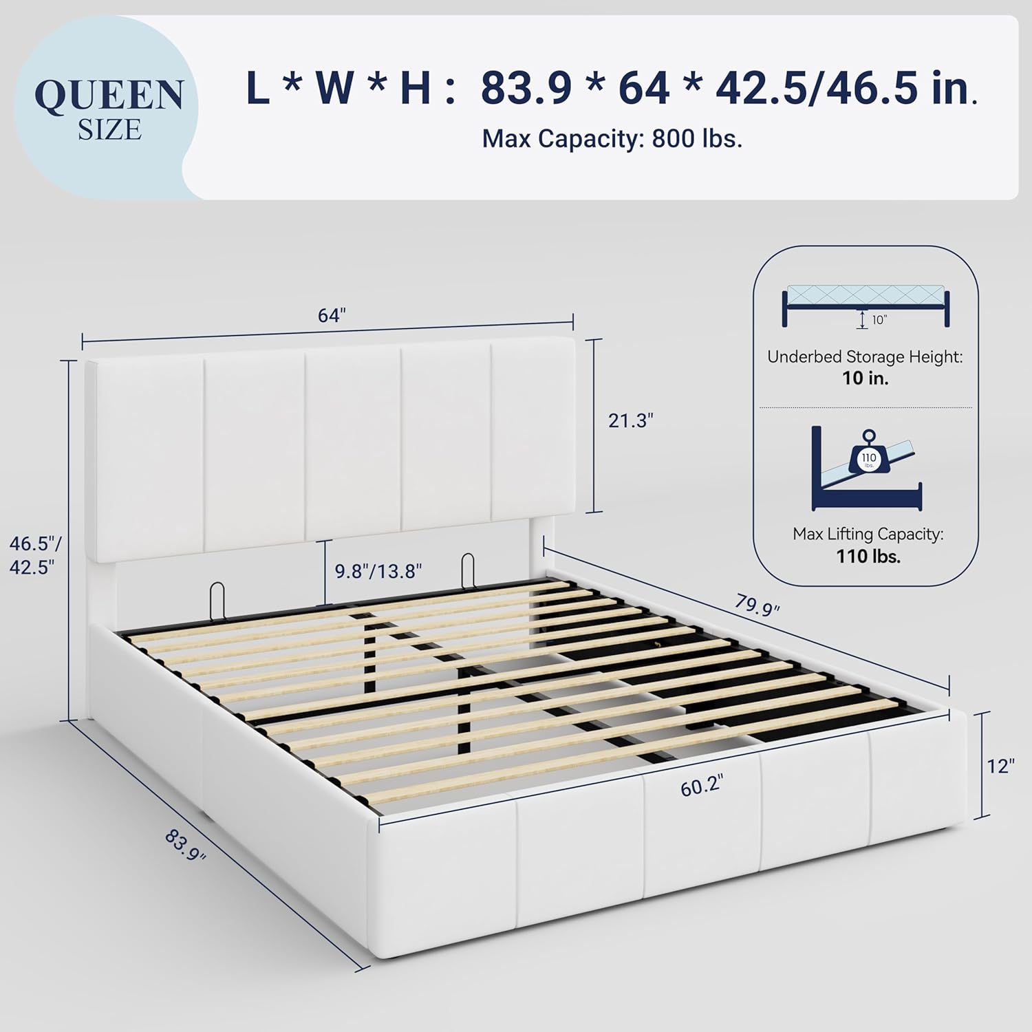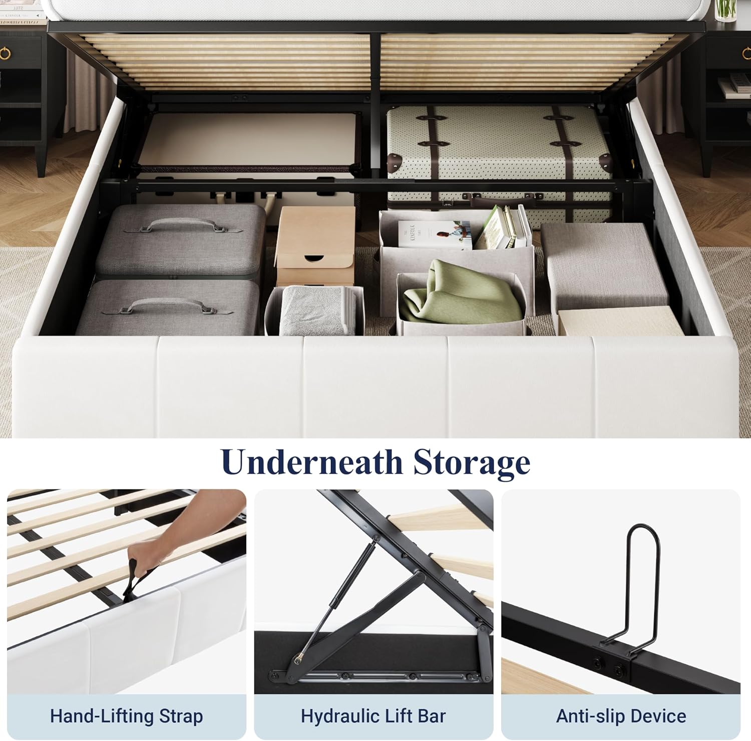 • Spacious Hidden Storage: Easily lift the platform with a smooth hydraulic mechanism to get a large under-bed storage area, perfect for storing bedding, clothes, or seasonal items while keeping your space organized and clean