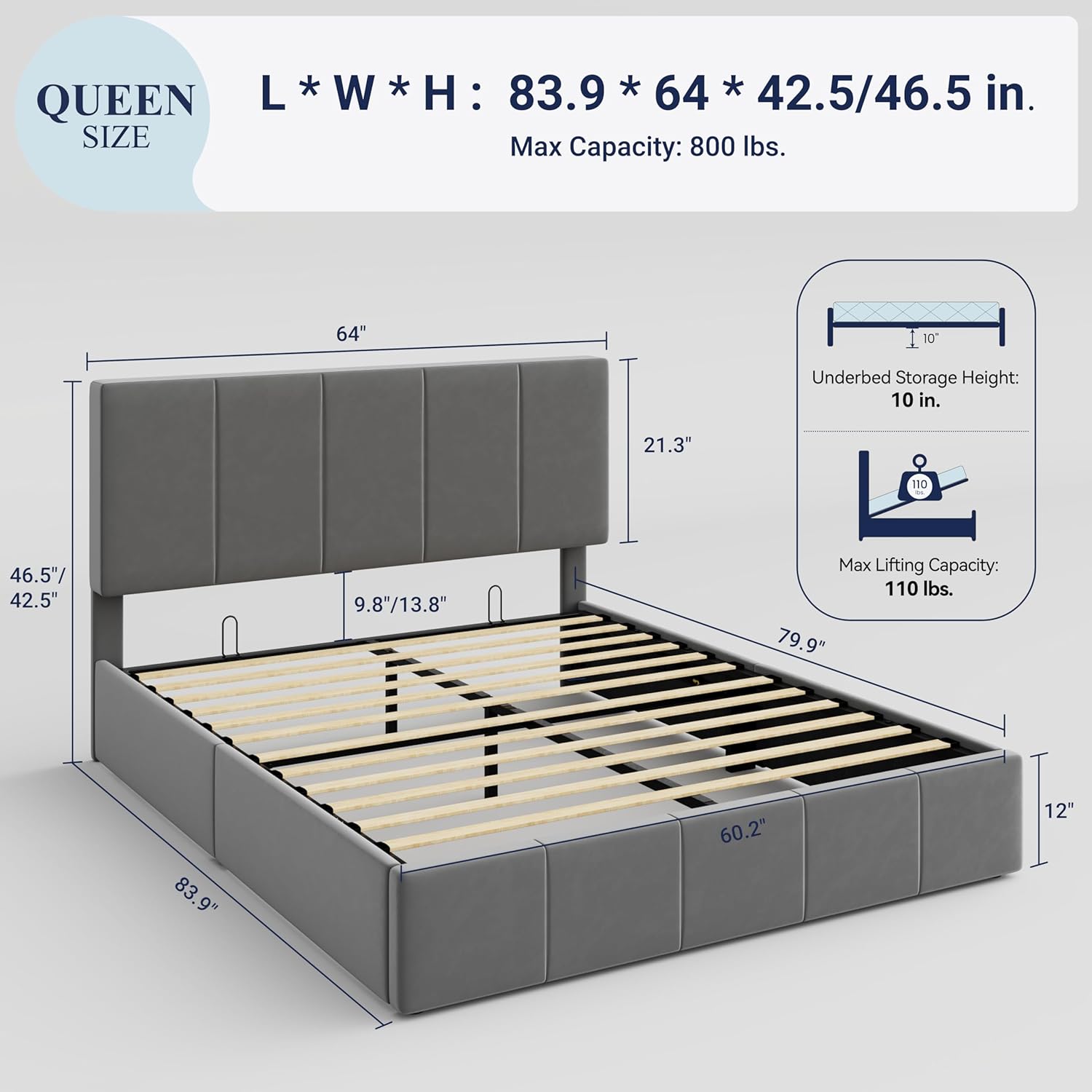 Allewie Queen Size Velvet Lift Up Storage Bed Frame, Vertical Channel Tufted Headboard, Hydrualic Underneath Storage, Upholstered Platform Bed, Wooden Slats Support, No Box Spring Needed, Gray