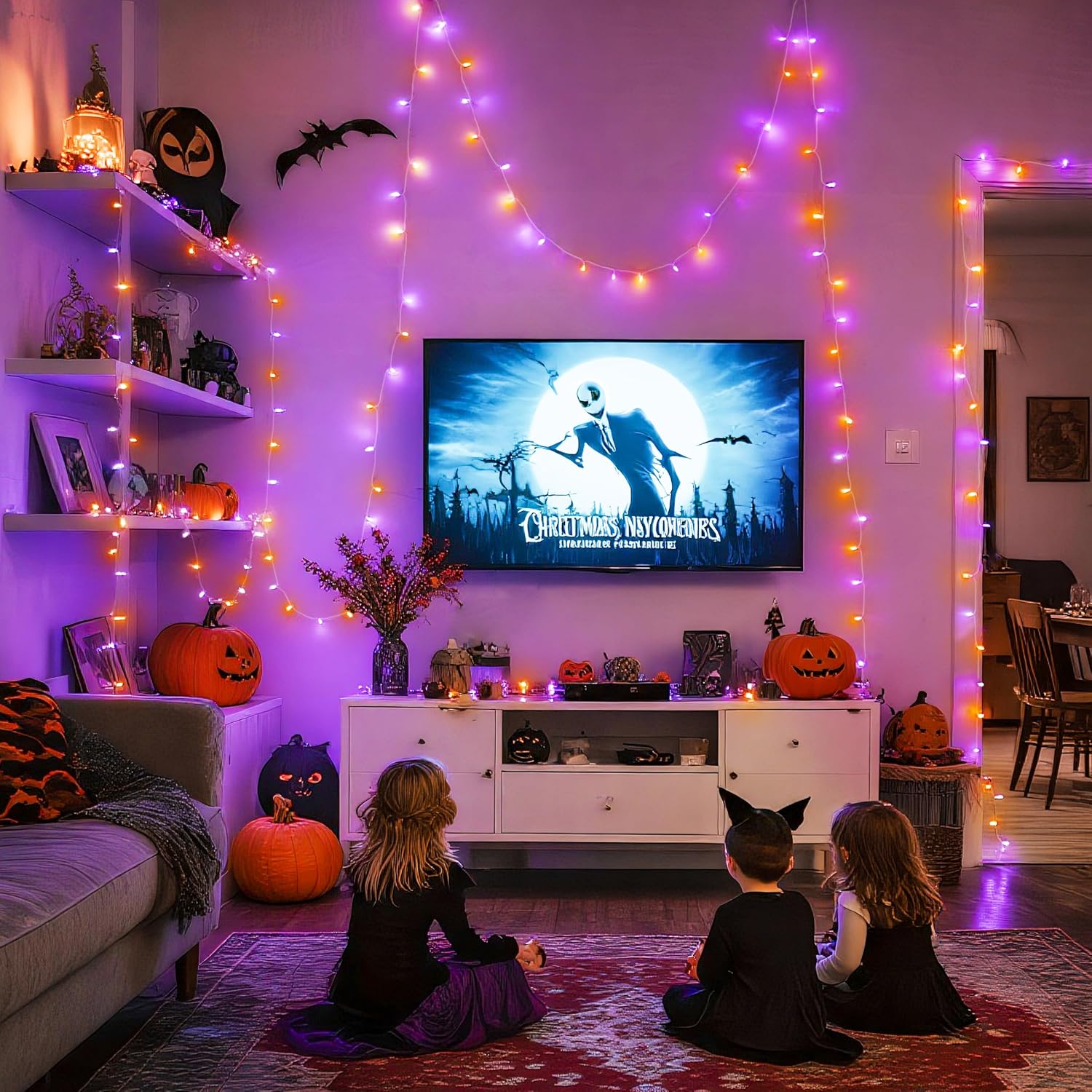- 【Orange Purple Halloween Lights Indoor & Outdoor】500 LED Halloween String Lights very suitable for Halloween decorations in your bedroom, living room, courtyard, garden and haunted house, of course, it can also add enough festive atmosphere to Halloween, carnival parties, Thanksgiving, Christmas parties