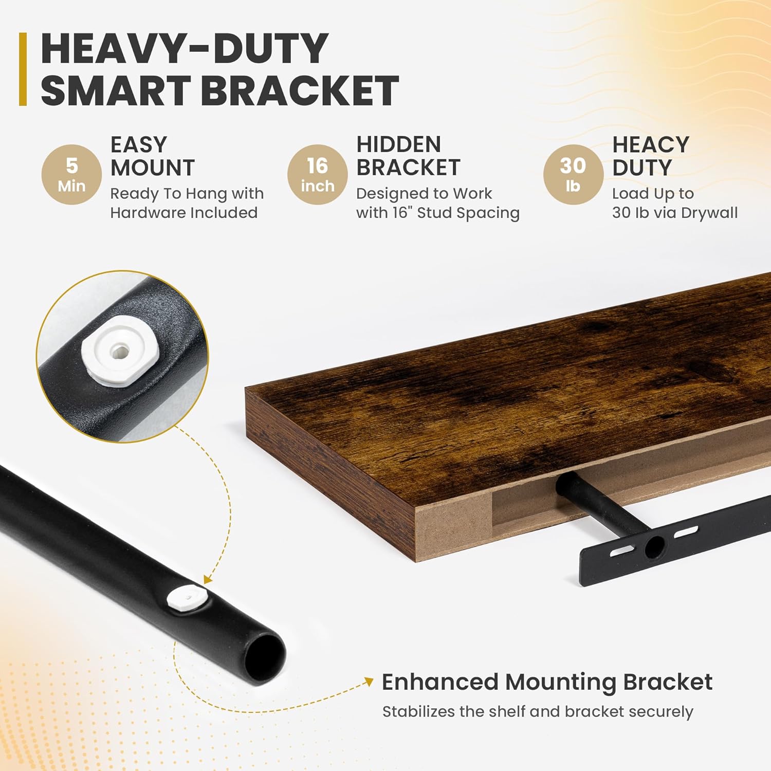 - [ROBUST & SECURE MOUNTING]: Equipped with a sturdy, hidden mounting bracket, these 16-inch floating shelves ensure solid support for your items. Designed for easy and secure installation, they come with all necessary hardware for a firm, wobble-free setup, allowing you to confidently display decor, photos, or functional items with style.