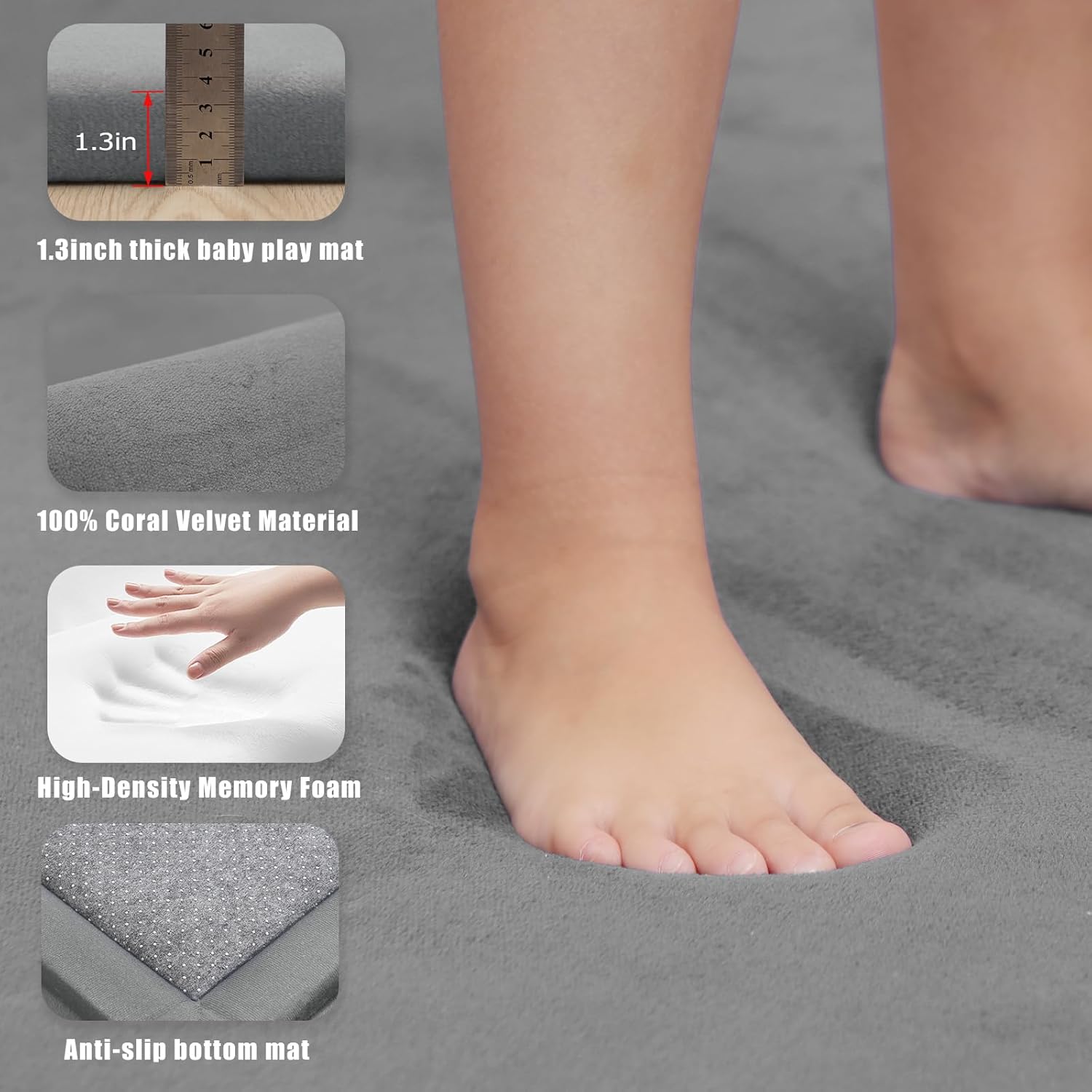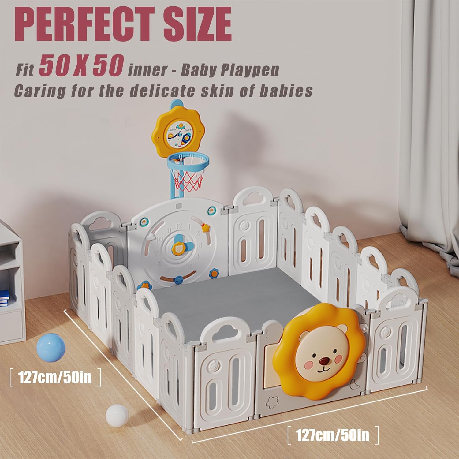 - SOFT TOUCH & CARING PROTECTION: Every exploration of the baby requires soft care. This baby play mat for floor is specially designed for the baby's delicate skin and play nature. The 1.3-inch thick memory foam filling gives the baby just the right support and a full sense of security. The surface is 100% coral fleece material, which does not shed or fall off. Our 50x50 playpen mat has a delicate, warm and skin-friendly touch, allowing the baby to fully immerse in a pleasant play time, and every moment is treated gently