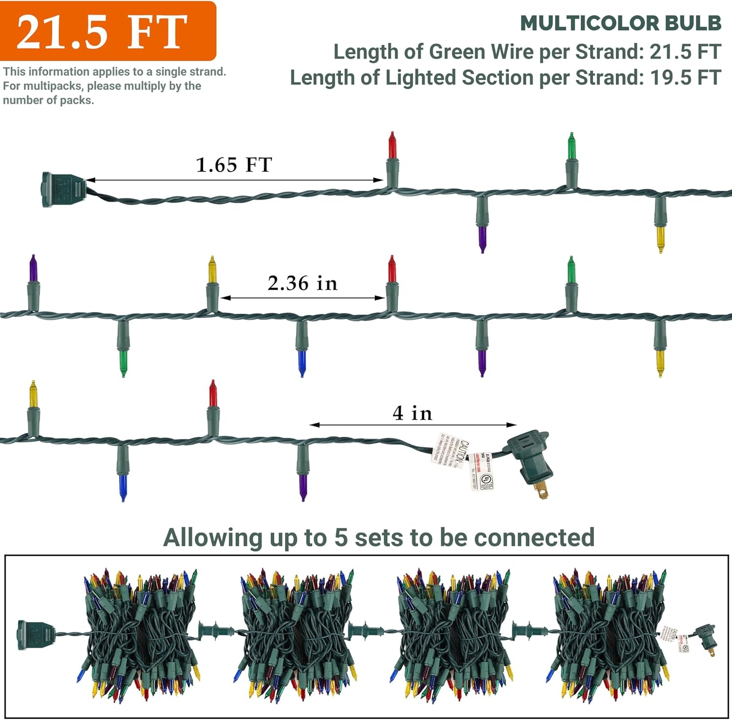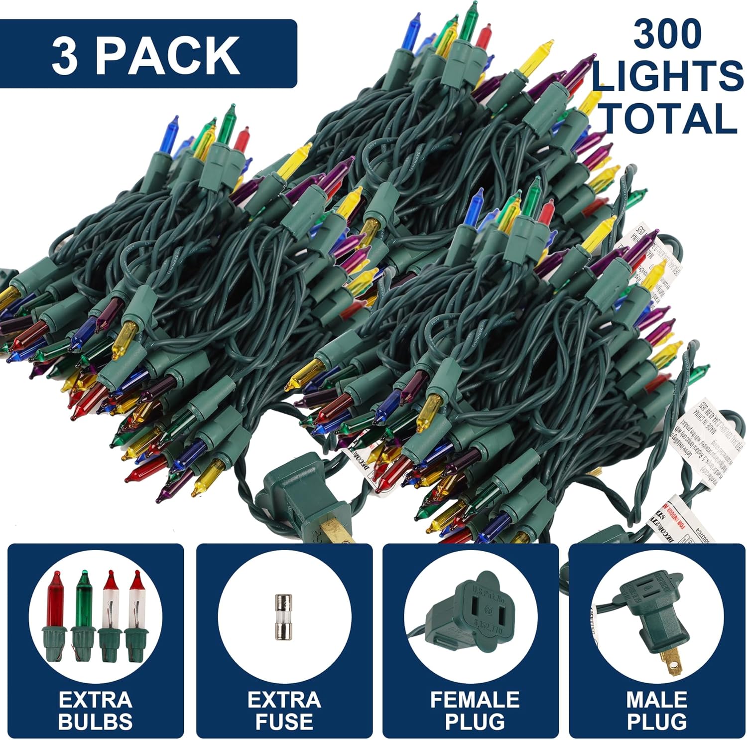 - Green Wire Christmas Lights: Our 3 pack 100-count multiclor (5 colors) incandescent mini lights will brighten up your home this Christmas. Each bulb is spaced 2.36 inches apart. A built-in 3A fuse ensures safe operation, and extra bulbs and fuses are included for replacements. These high-quality UL-certified lights prioritize the safety of your family