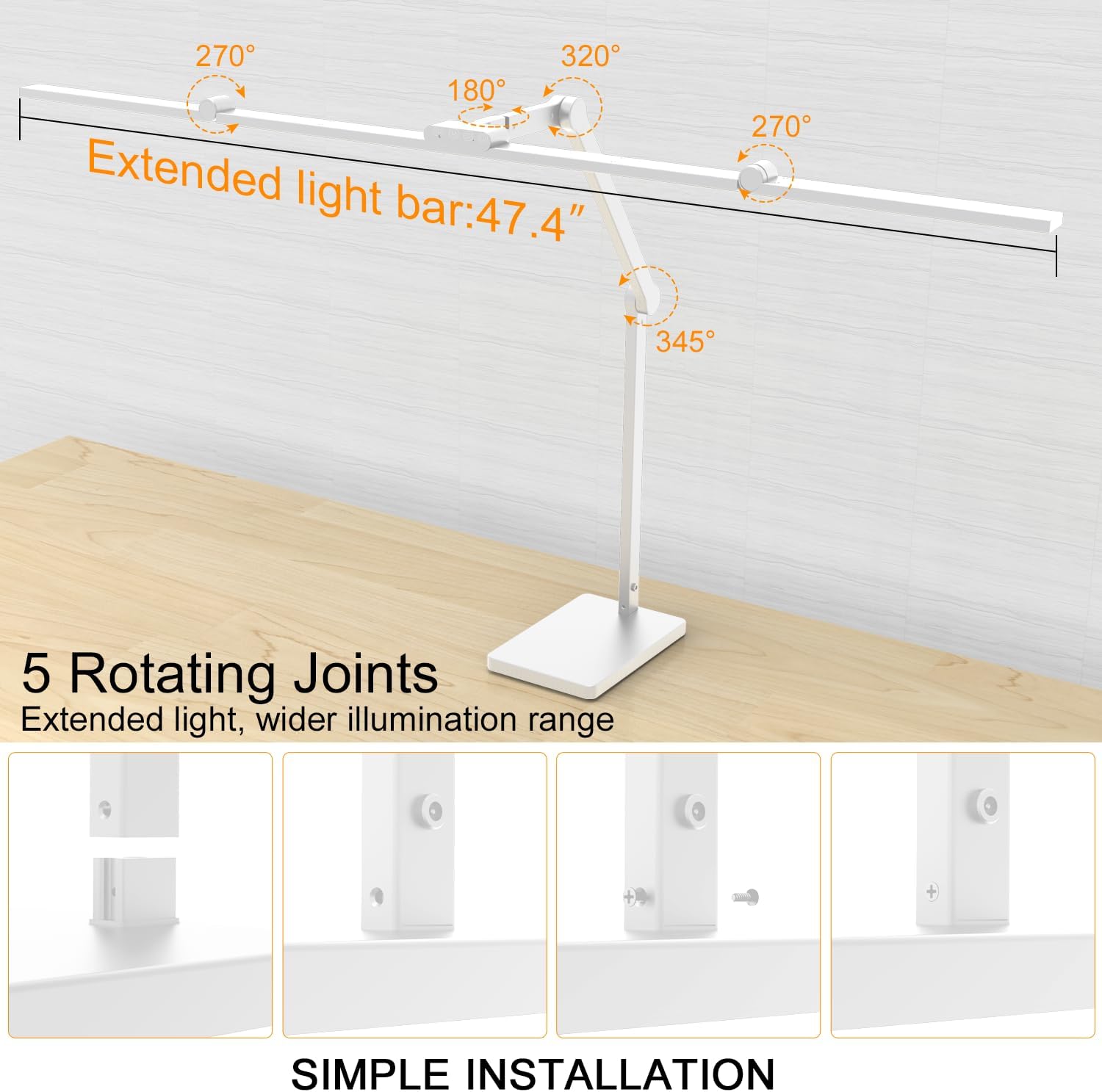 - ULTRA WIDE & ULTRA BRIGHT: This 36W led desk lamp features 47.4 inches adjustable three section light bar, ensuring no dark areas while illuminating a larger area. The desk light is equipped with high quality chips, delivering the light 3000 LM. An excellent color rendering index (RA>90), Simulating nature light that will accurately reveal their truest colors. Meanwhile, the office lamp provide uniform illumination without flicker creates comfortable working environment that reduces eye fatigue caused by computer screen, it's an essential part of the office.