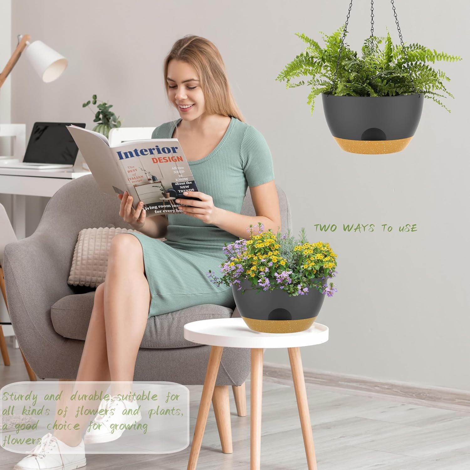 10 Inch Hanging Baskets 2 PC with Chains, Self-Watering Hanging Planters for Indoor Outdoor Plants, Plastic Hanging Flower Pots,Black Brown