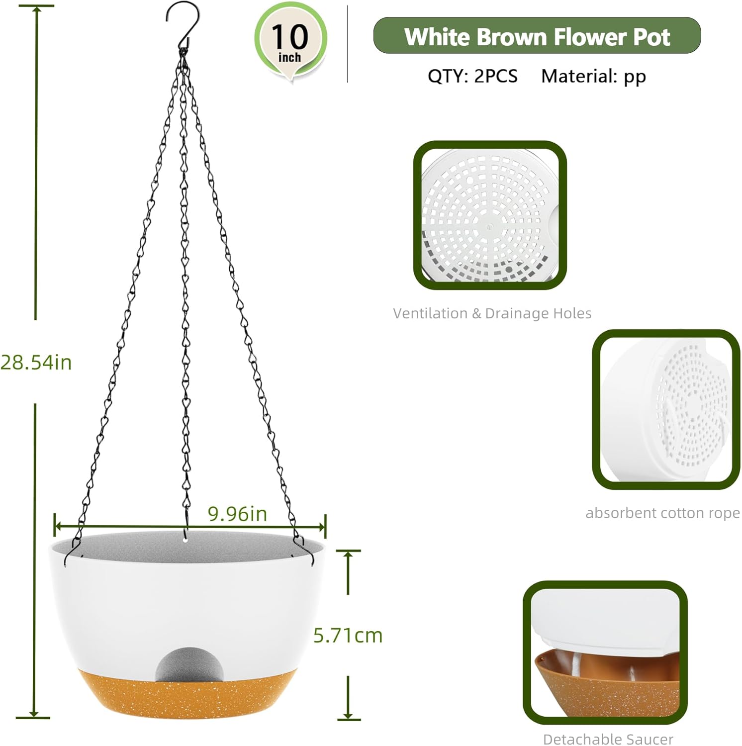 10 Inch Hanging Baskets 2 PC with Chains, Self-Watering Hanging Planters for Indoor Outdoor Plants, Plastic Hanging Flower Pots,White Brown