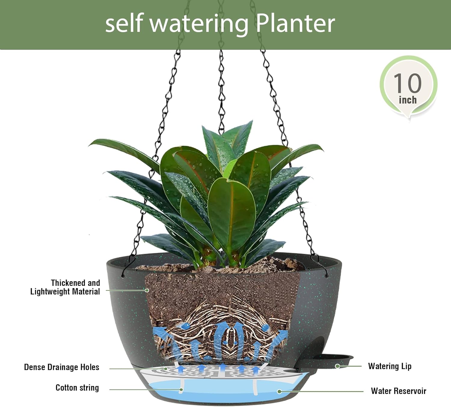 • 【Self-Watering Hanging Flower Pots with Removable Saucer】the appearance and structural design of the Hanging Pot prevents overwatering and acts as a water reservoir to promote Plant growth. It is suitable for a variety of Hanging Pot Plants, such as ivy, Herbs, Ferns, Philodendrons, Succulents, Flowers or other Plants