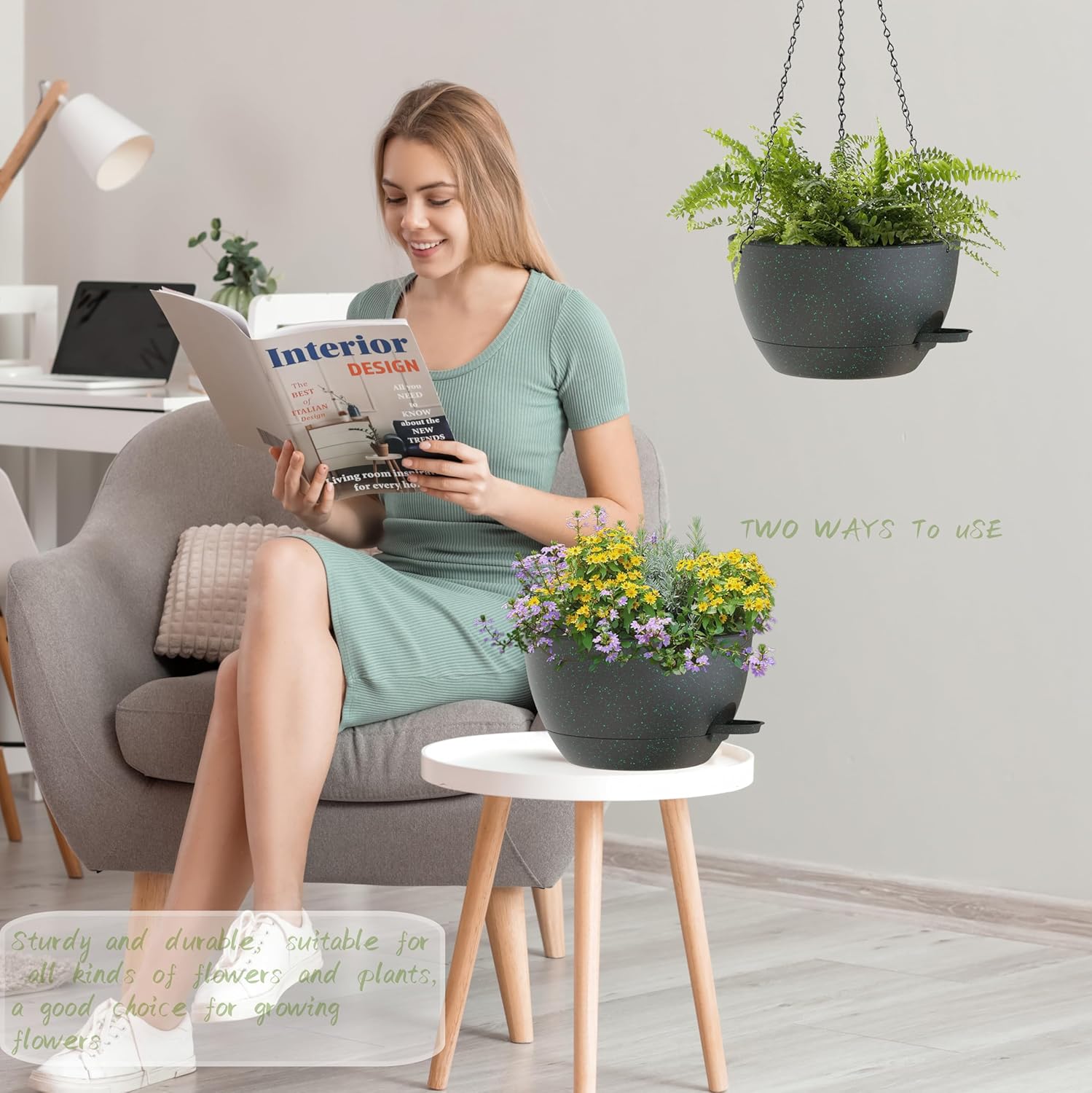 10 Inch Hanging Baskets 2 PC with Chains, Self-Watering Hanging Planters for Indoor Outdoor Plants, Plastic Hanging Flower Pots,Black with Green Speckles