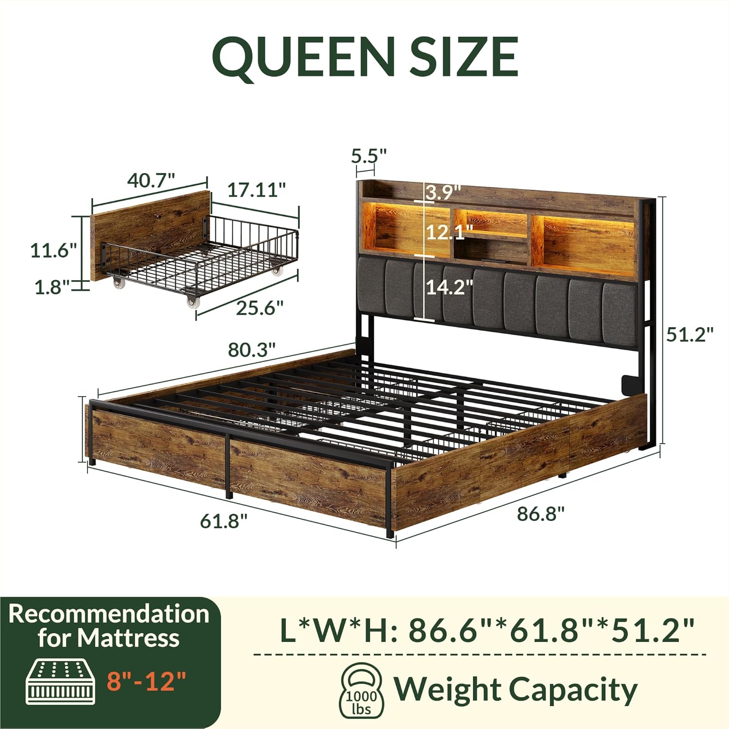 - Special Feature : Easy Assembly, LED Strip Lights, No Box Spring Needed, Squeak Resistant, Storage Drawer