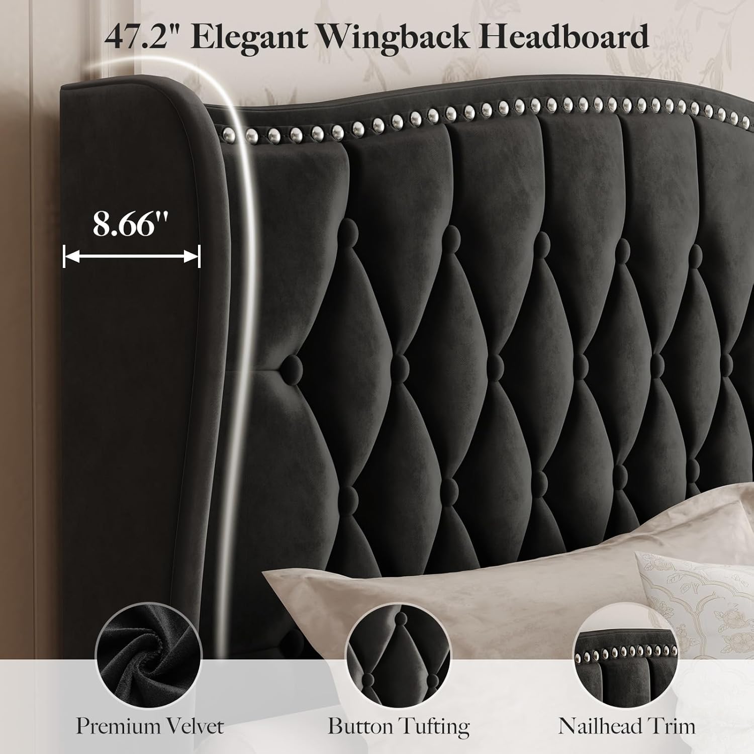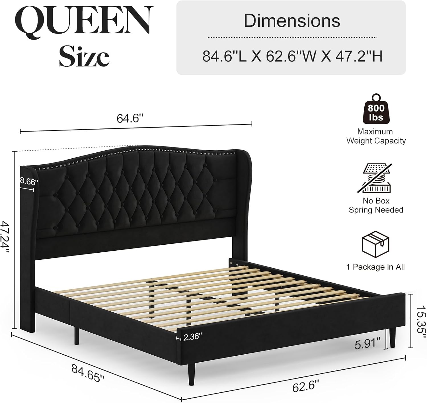 Belffin Queen Bed Frame with Headboard, Luxury Upholstered Velvet Platform Bed with Wingback, Button Tufted & Nailhead Trim, Anti-Slide Tall Footboard, No Box Spring Needed, Noise-Free, Black
