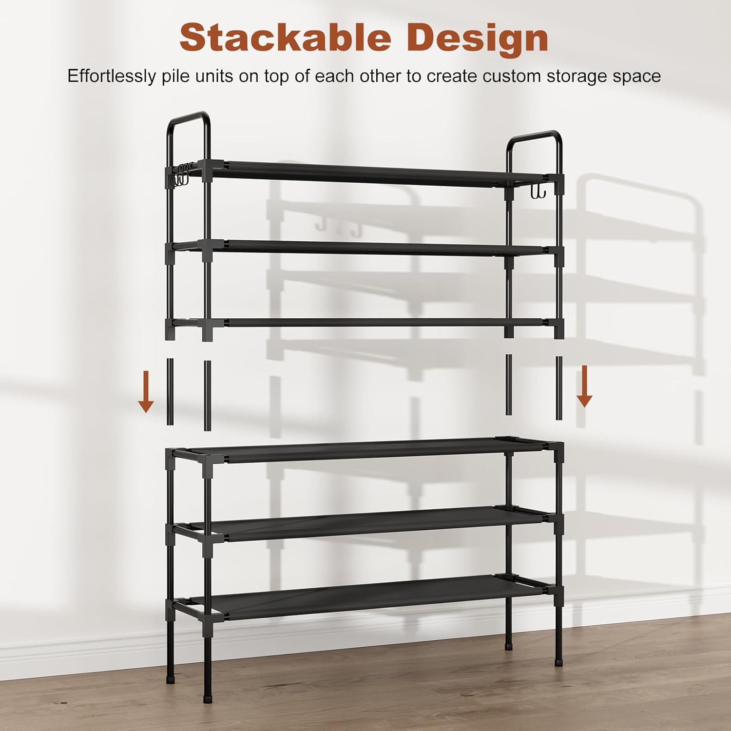 3-Tier Shoe Rack for Closet, Stackable Shoe Organizer with 5 Hooks, Long Shoe Shelf Storage for Sneakers & Boots, Free Standing Shoe Rack for Entryway Dorm Garage Small Spaces, Black