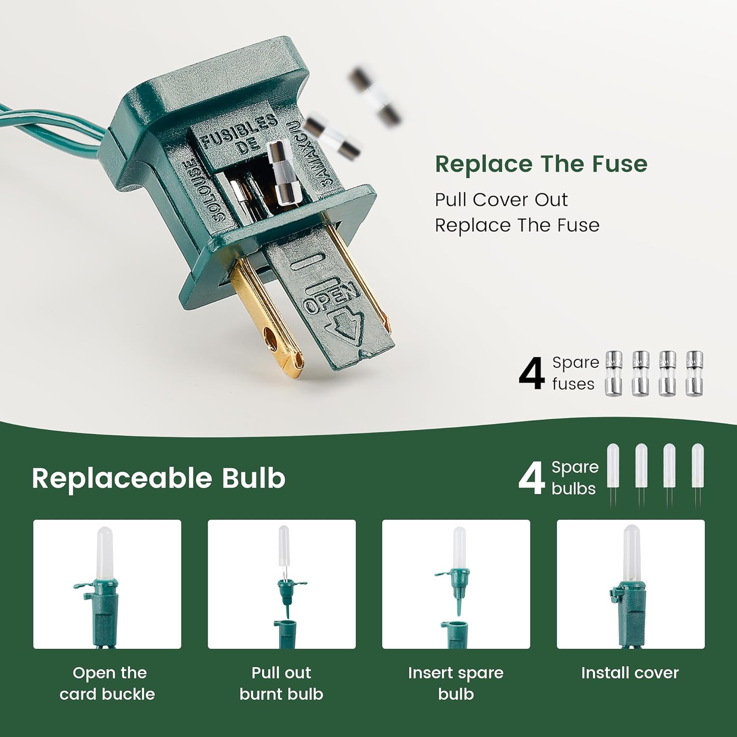 - ♥Steady-lit on and Replacement Parts : Our bulb lighting sets can still stay lit when a bulb was removed, loose or missing, and easy to fix and replace with spare extra bulbs and fuse when one of bulb burn out or break. A little heating is completely natural and there is fuse inside of the plug to protect the lights from burnout. The function of the rectifier is to divert voltage, protect the LED Christmas Lights from continuous light emission, and prevent damage to the circuit Also we provide 4 x Extra fuse and 4 x Extra LEDs for you to replace.