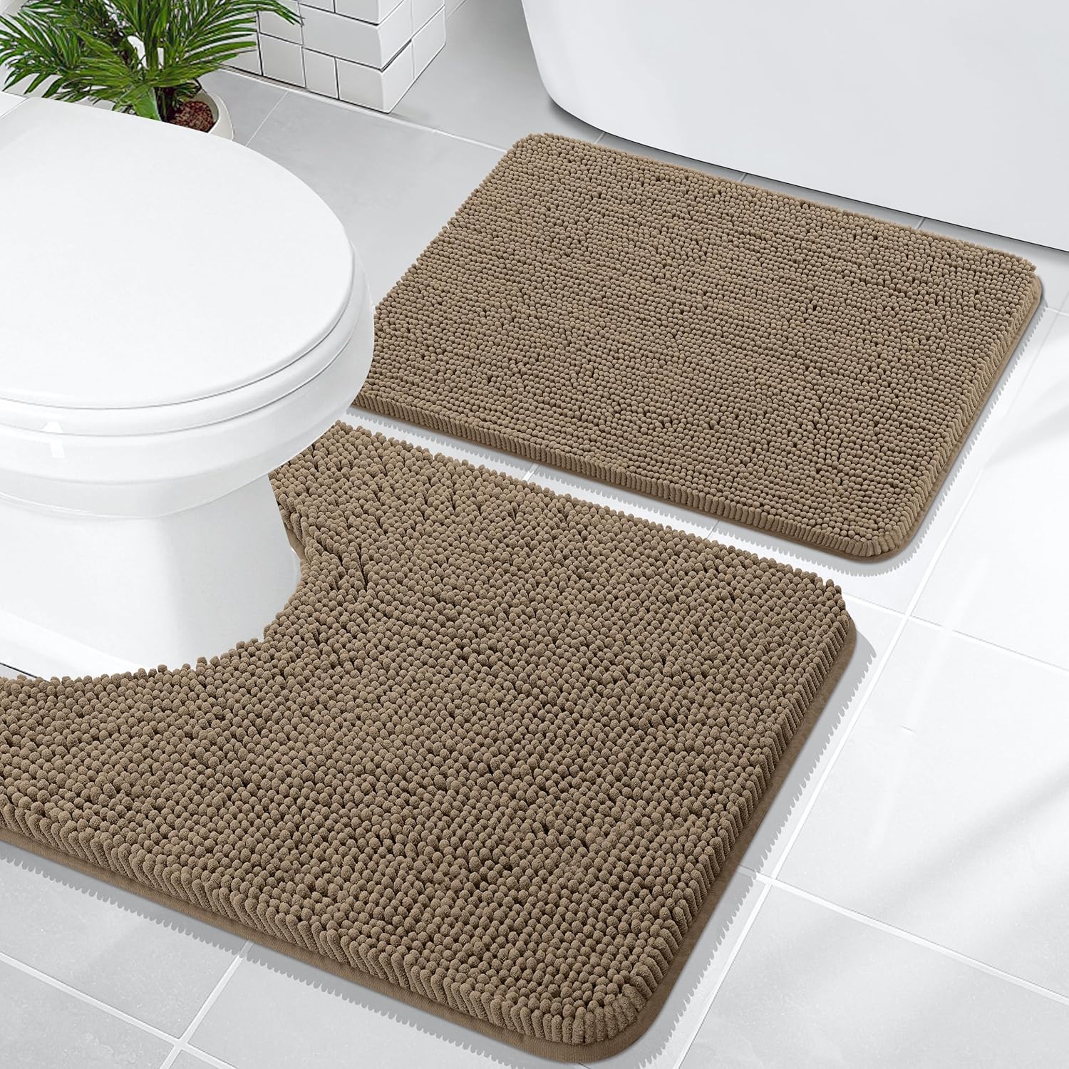 OLANLY Bathroom Rugs Sets 2 Piece, Soft Absorbent Chenille Bath Mats and U-Shaped Contour Toilet Mat Area Rug Set, Machine Washable Bath Carpet, Home Decor Accessories(24"x16"+24"x20", Tan)