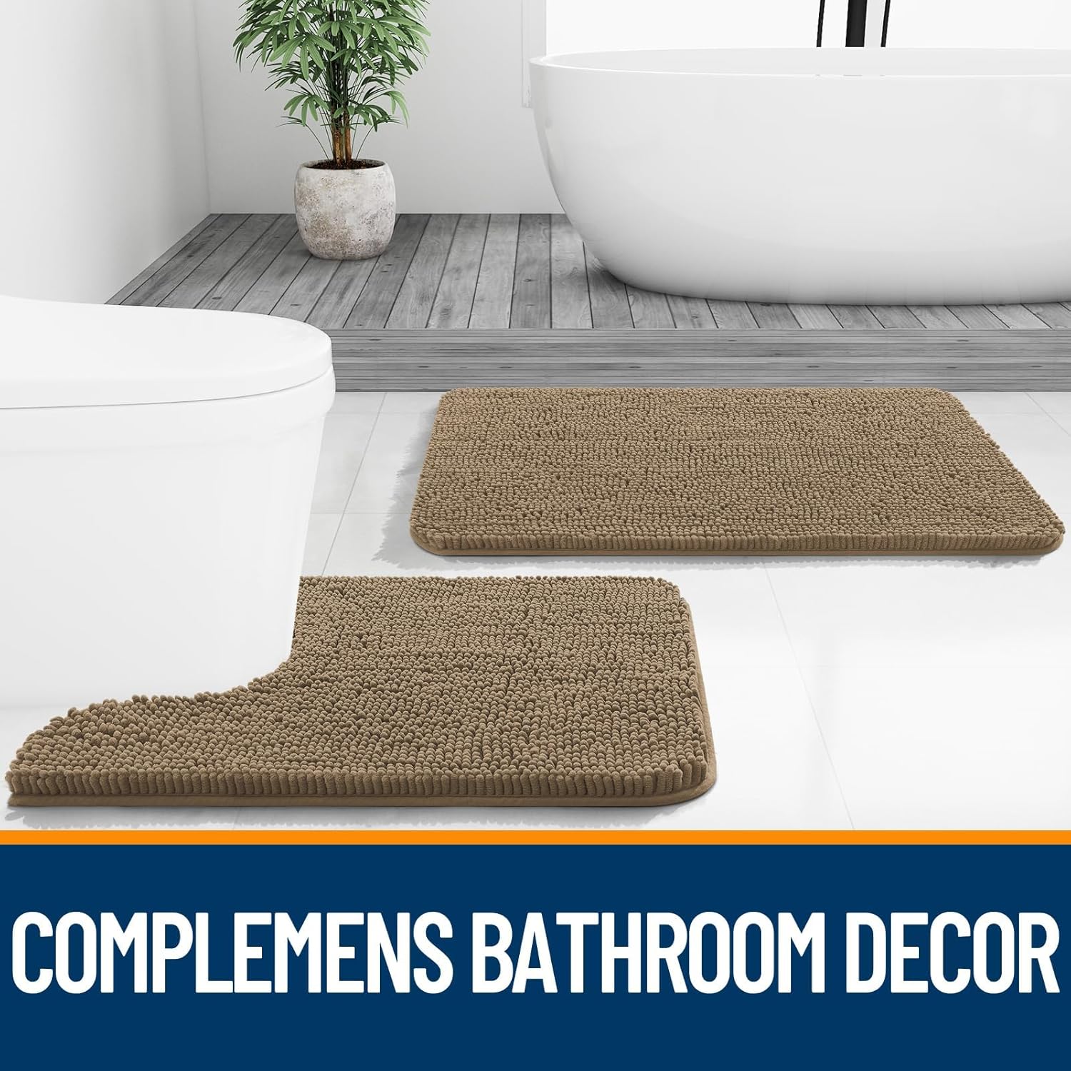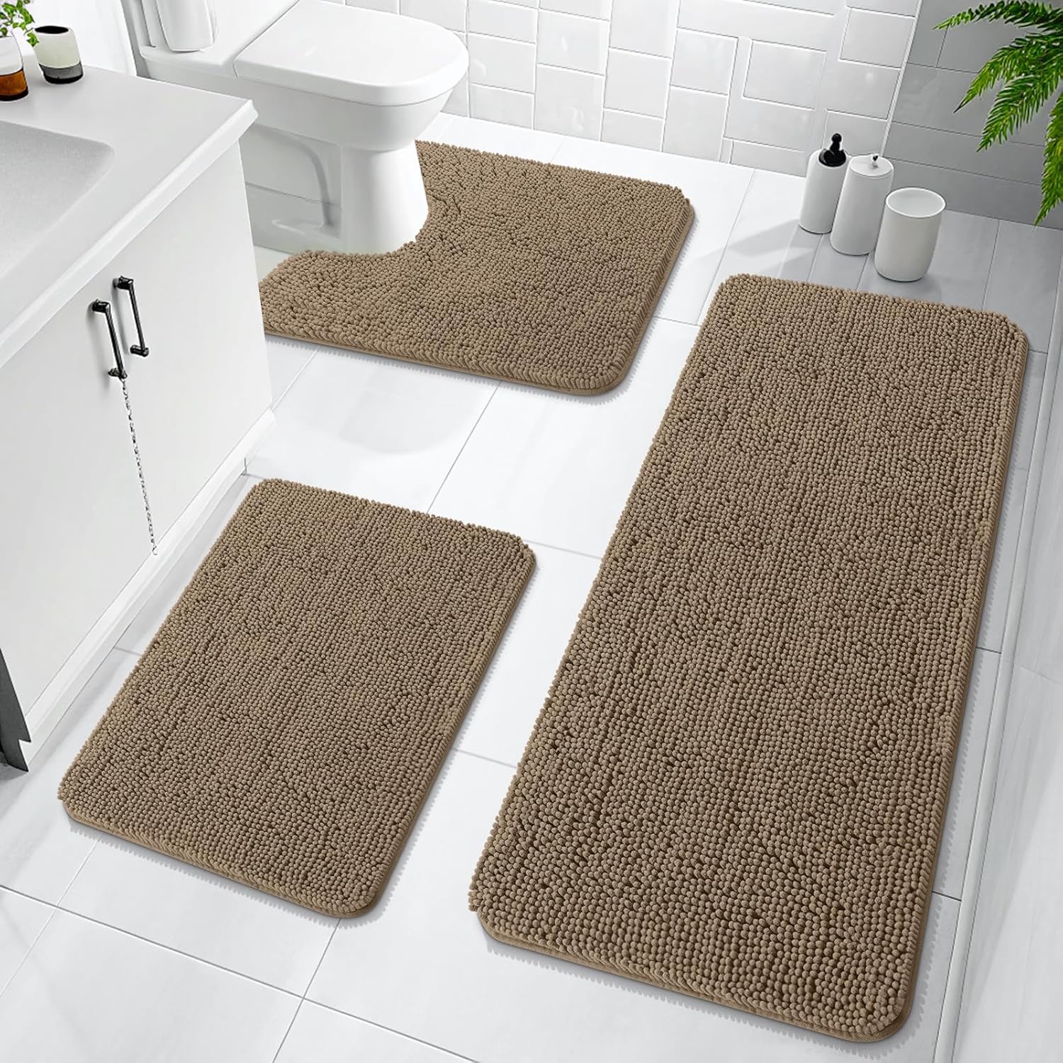 OLANLY Bathroom Rugs Sets 3 Piece, Soft Absorbent Chenille Bath Mats and U-Shaped Contour Toilet Rug, Quick Dry, Home Decor Accessories, Bath Mat Set for Bathroom (47"x20"+24"x16"+24"x20", Tan)