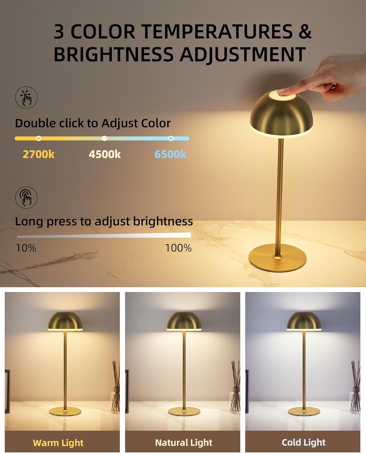 • Dimmable & Three Light Modes: They offer three colors to suit your mood: warm white(2700K), natural white(4500K), or cool white(6500K). Cordless lamps have stepless dimming, and it remembers your color and brightness option when you turn it back on so you don't have to keep cycling for the desired option