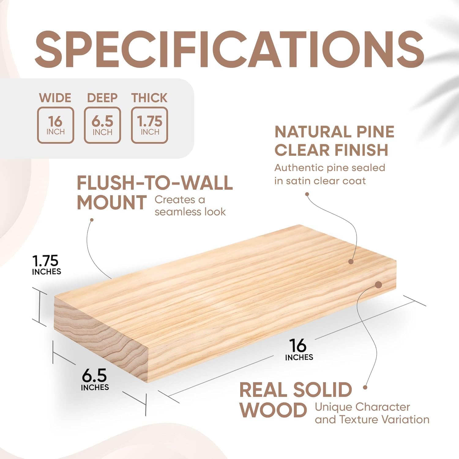 - AUTHENTIC WOOD GRAIN - Enjoy the timeless elegance of real wood. Handcrafted from the finest 1.75" Thick natural pine wood measuring 16" Wide x 6.5" Deep x 1.75". Our shelves highlight the inherent charm and durability of high-quality wood. Each Shelf reveals its unique character of knots and natural wood grain; each ledge is a little different but equally stunning.
