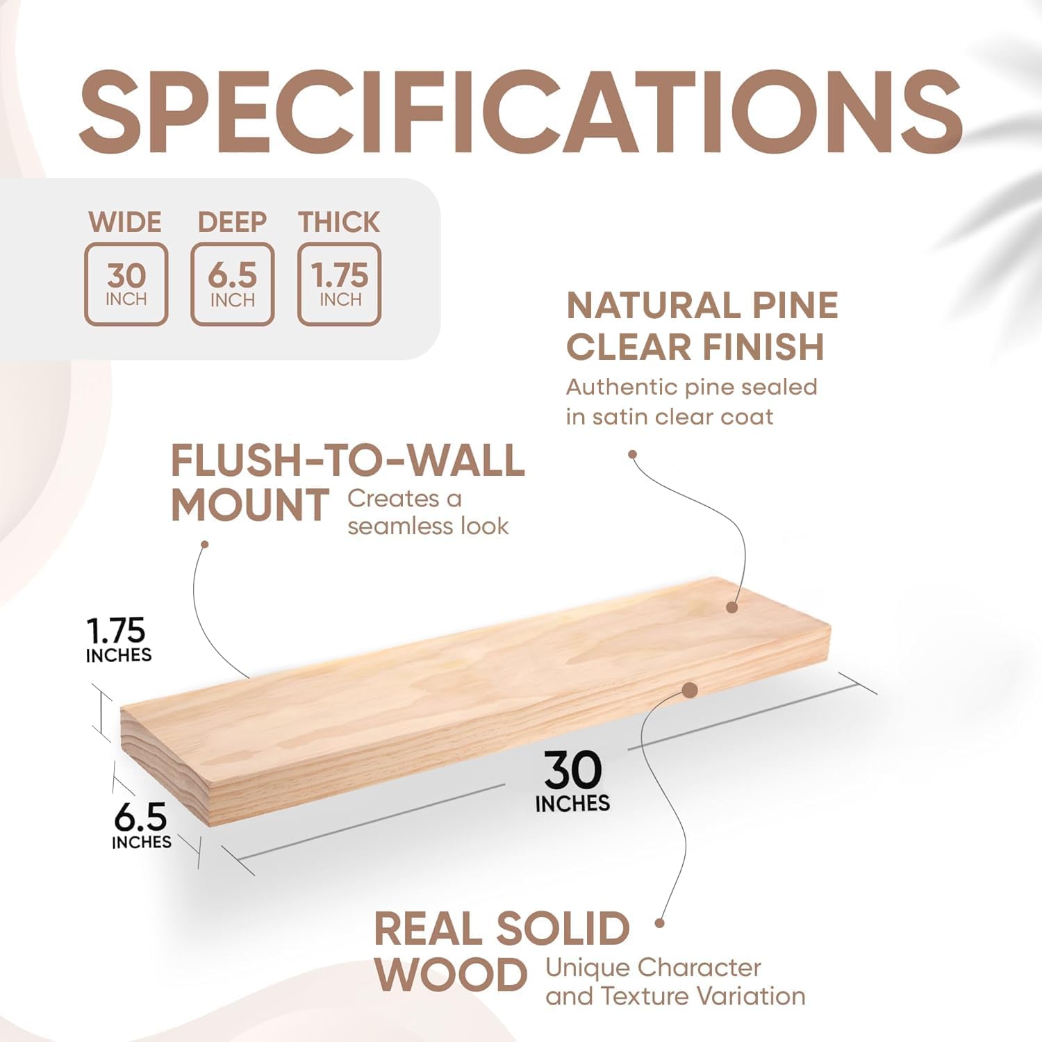 - AUTHENTIC WOOD GRAIN - Enjoy the timeless elegance of real wood. Handcrafted from the finest 1.75" Thick natural pine wood measuring 30" Wide x 6.5" Deep x 1.75". Our shelves highlight the inherent charm and durability of high-quality wood. Each Shelf reveals its unique character of knots and natural wood grain; each ledge is a little different but equally stunning.