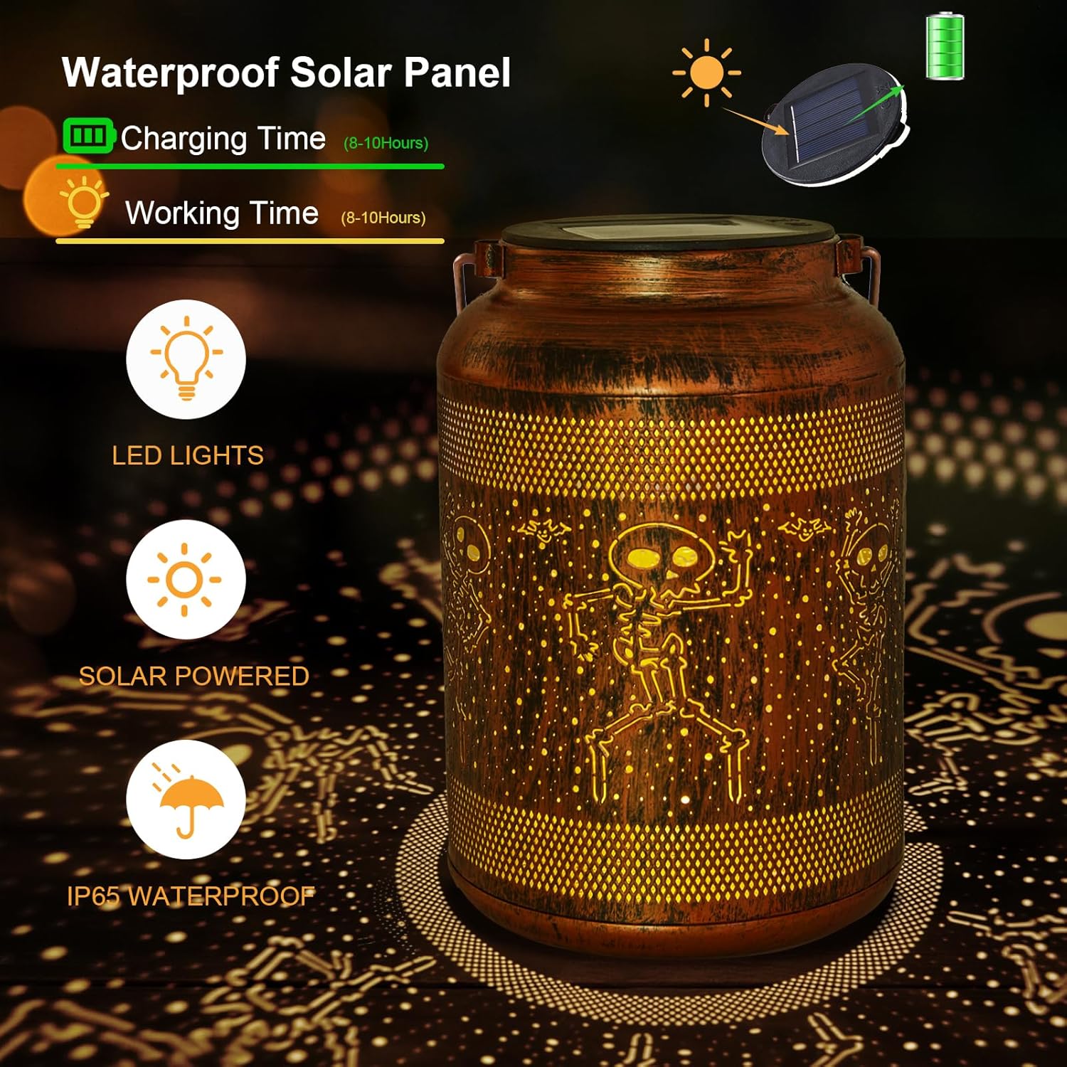 - 【Waterproof and Durable】Halloween solar lights outdoor are made of high quality metal, durable. IP65 waterproof rating protects against rain, snow and dust, so solar lantern halloween skeleton provide good lighting even on rainy or cloudy days without worrying about rain or snow