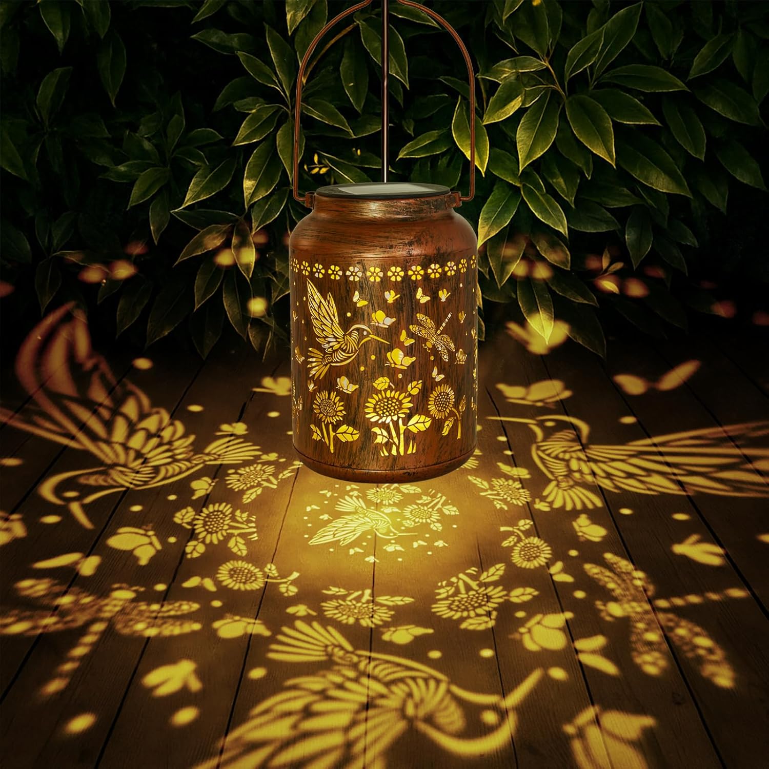 - 【Elegant Vintage Design】Featuring a classic antique bronze finish and elegant pattern, this solar light radiates a warm light at night. The beautiful shadow effect creates a cozy atmosphere, perfect for outdoor parties or decorative lighting.Outdoor solar hummingbird lantern is the best gifts for mom, sister, grandma, women birthday