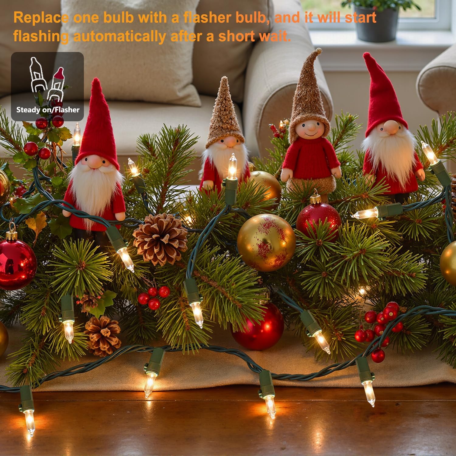 - Creative Mini Christmas Lights: ooLALoo warm christmas lights on green wire includes 50 clear incandescent mini bulbs, total length 13 ft and lighted length of 11ft. Each bulb is spaced 2.76 inch apart. The set comes with 2 flasher bulbs & 2 extra bulbs, you can change one bulb with a flasher bulb, and it will start flashing automatically after a short wait.