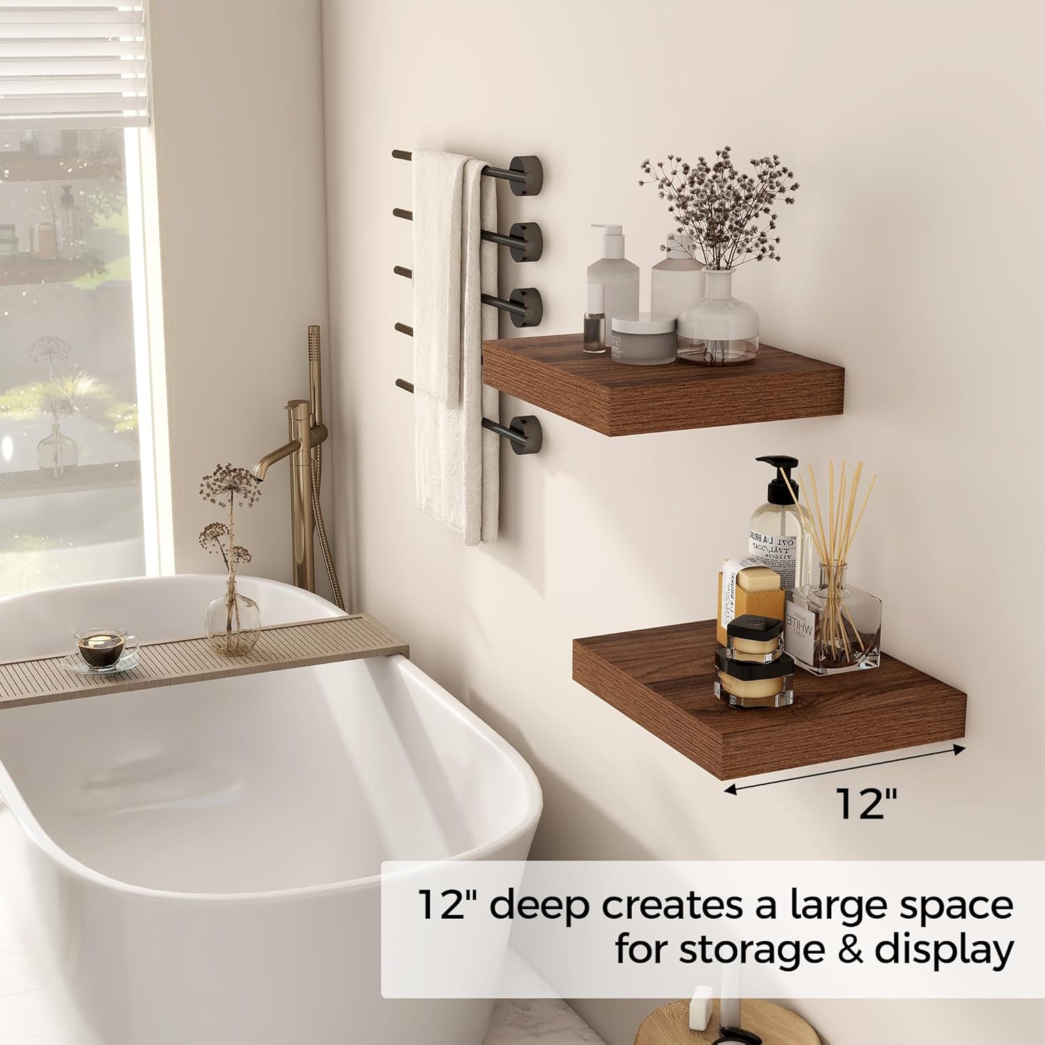Fun Memories 12 Inch Floating Shelf, Rustic Wood Wall Shelves for Wall Decor & Storage, 12 x 12 Floating Shelf for Living Room, Bathroom, Bedroom, Walnut, Set of 2