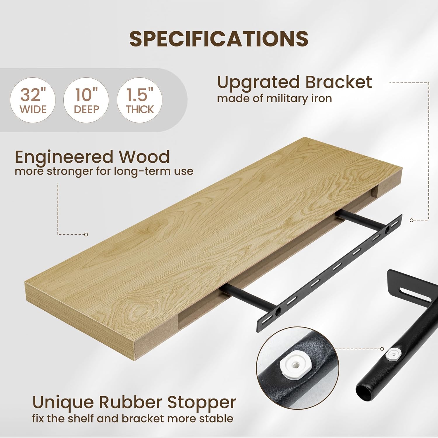 - INVISIBLE & STURDY BRACKET: This floating shelf features a simple and elegant design with an invisible bracket that creates a floating effect. The sturdy hidden support and special rubber stoppers ensure the shelf stays firmly in place, offering both strength and a clean, modern style