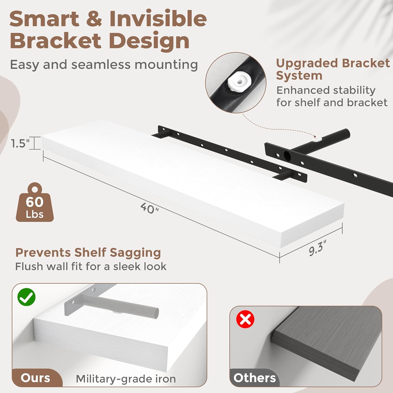 - Built to Last: Features reinforced steel brackets and a bottom set screw to prevent sagging or sliding – a common issue with cheaper floating shelves.