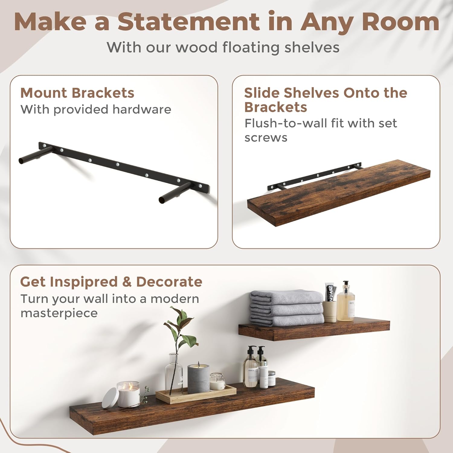 Floating Shelves for Wall with Invisible Brackets, Wall Mounted Engineered Wood Shelves with Wood Grain for Living Room, Bathroom, Kitchen Decor and Storage, Oak, 24"L Set of 2, Rustic Brown