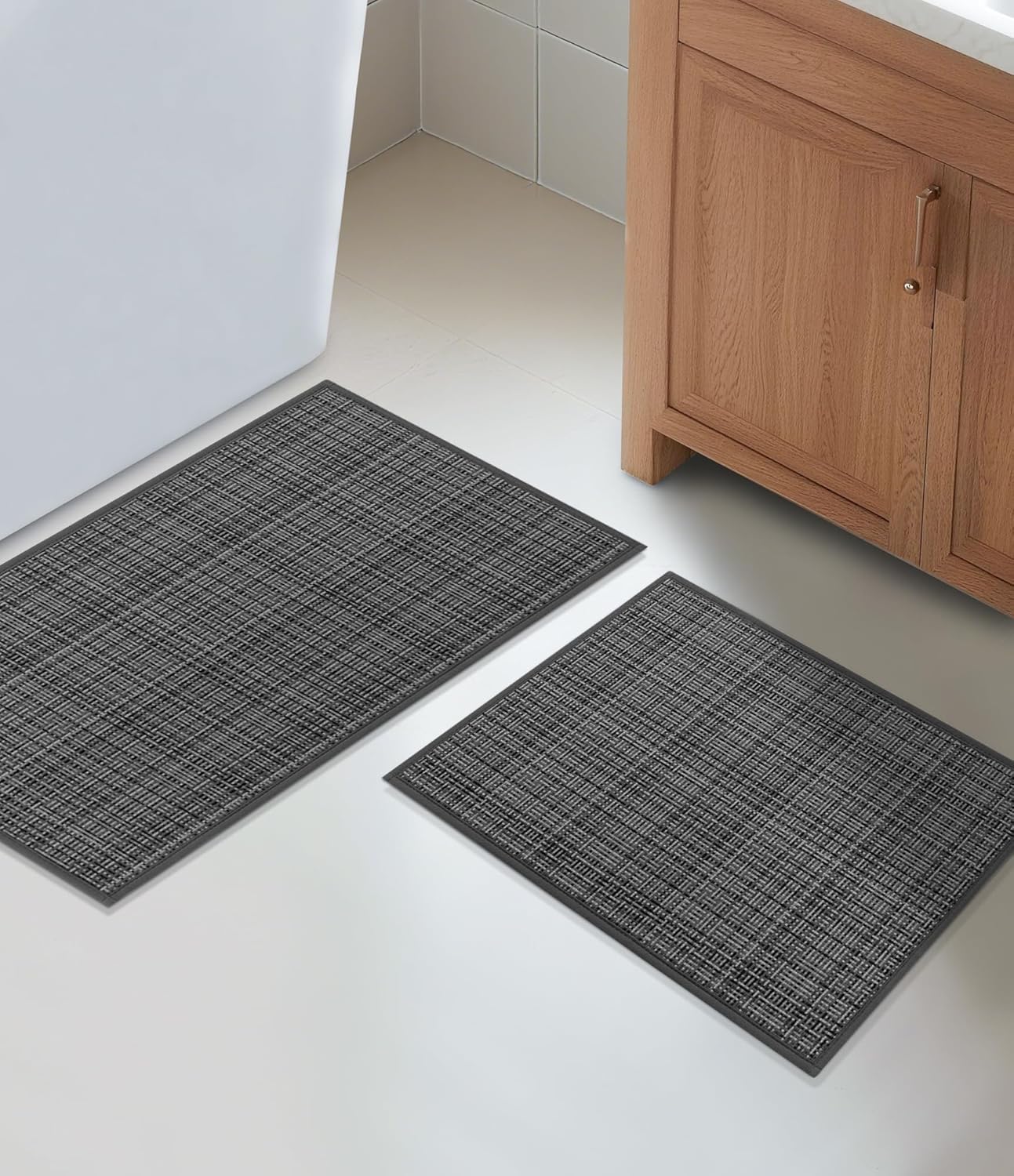 YIHOUSE Bathroom Rugs Sets 2 Pieces, Dark Grey Ultra Thin Bath Mats Fit Under Door, Absorbent Quickly Dry Rubber Backing Braided Bath Mat Set, Non Slip Washable Bath Rugs for Bathroom Floor, Grey