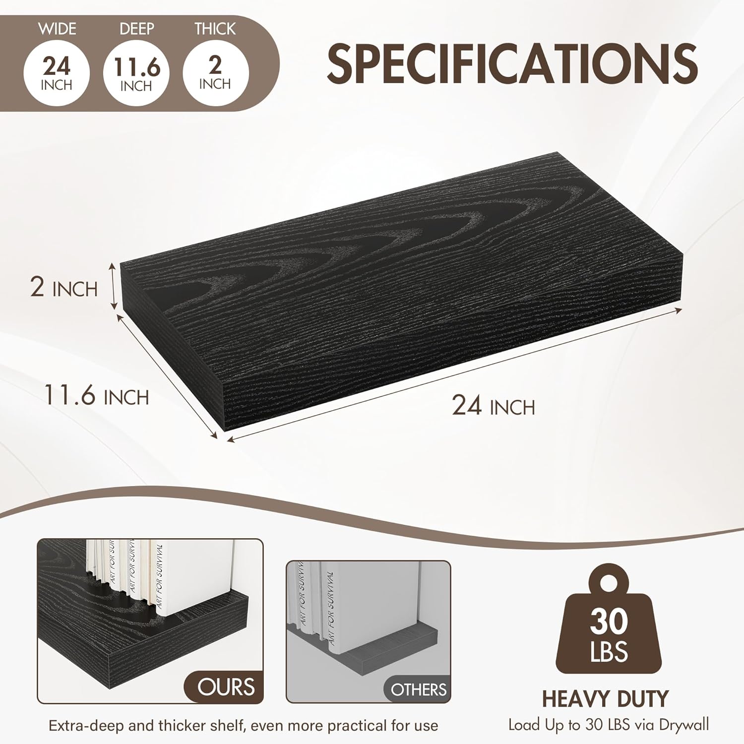 24 Inch Floating Shelves, 12" Deep Floating Shelf Wall Mounted, 24" Wall Shelves, Rustic Deep Bookshelf, Extra Deeper & Thicker Display Shelves for Bedroom, Living Room, Black, Set of 2