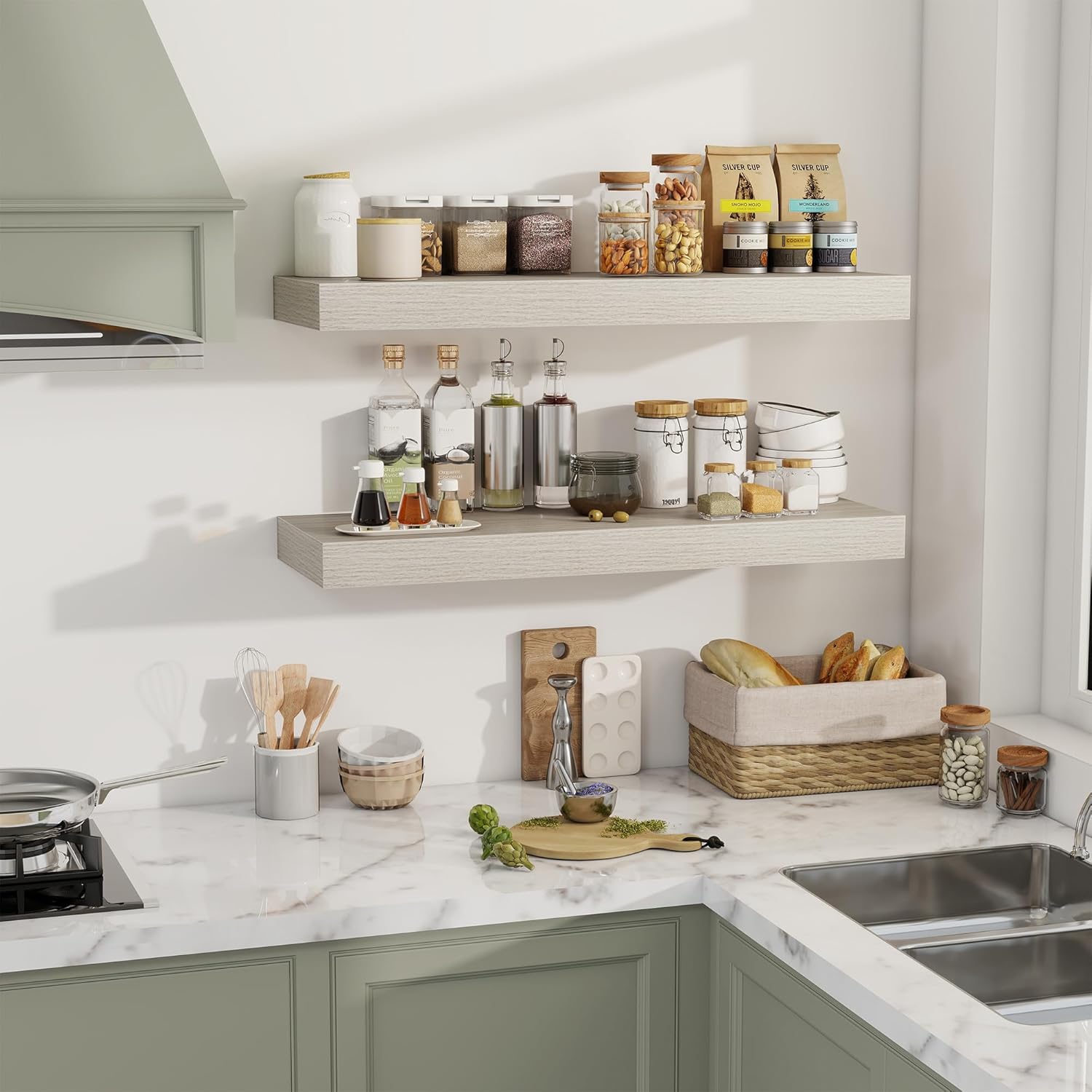 - [GENEROUS DISPLAY & STORAGE] With an expansive 12-inch depth, these floating shelves offer abundant room for books, kitchen essentials, decorative accents, and more. The extra-wide surface accommodates larger items like potted plants, baskets, or framed art, while the 2-inch thick design ensures sturdy support. Perfect for organizing and showcasing your favorite pieces without compromising on style or functionality.