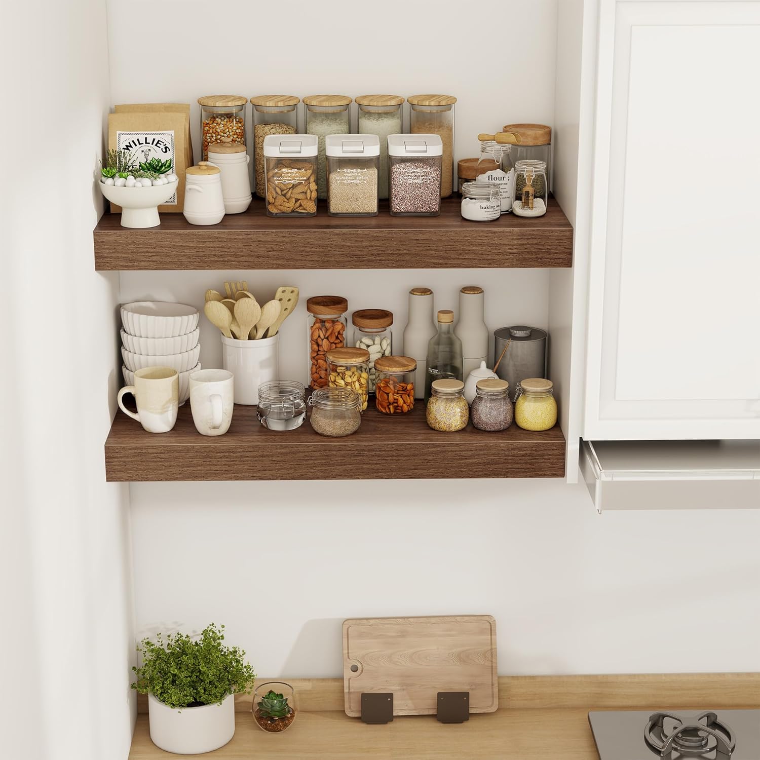 - [SPACE-SAVING WALL SOLUTION] Ideal for maximizing small rooms, kitchens, or cozy apartments, these shelves create storage without cluttering floors. Their floating design opens up living areas, making spaces feel airy and well-organized. Use them in entryways, bathrooms, or home offices to keep daily essentials neatly displayed yet within easy reach.