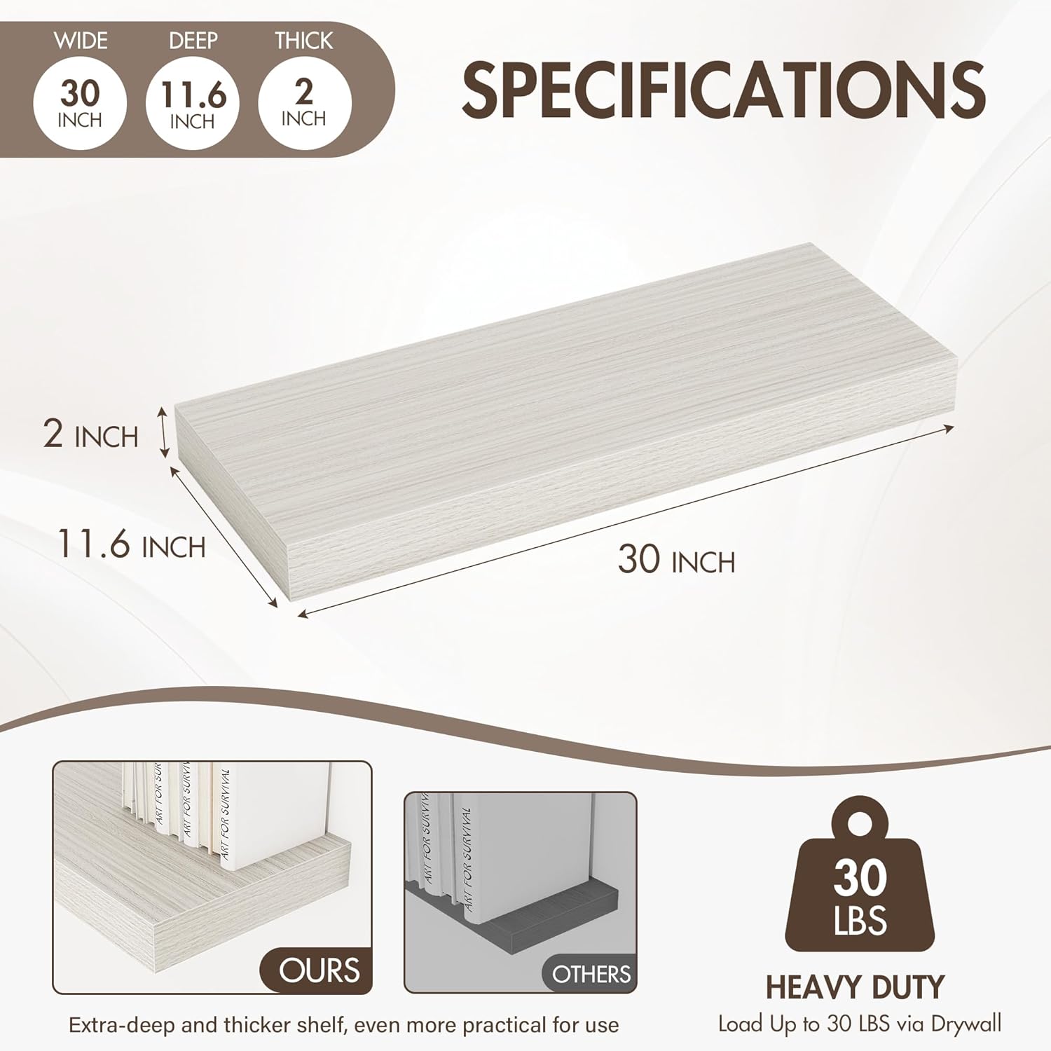- [VERSATILE FARMHOUSE MODERN DESIGN] These 30-inch hollow-core floating shelves blend rustic charm with sleek contemporary style. Crafted from high-quality engineered wood, their authentic wood grain finish adds natural warmth and character to any space. Display them horizontally, vertically, or in creative clusters to enhance both farmhouse-inspired and modern minimalist interiors. The 12-inch depth and 2-inch thickness provide a bold, substantial look while maintaining effortless elegance.