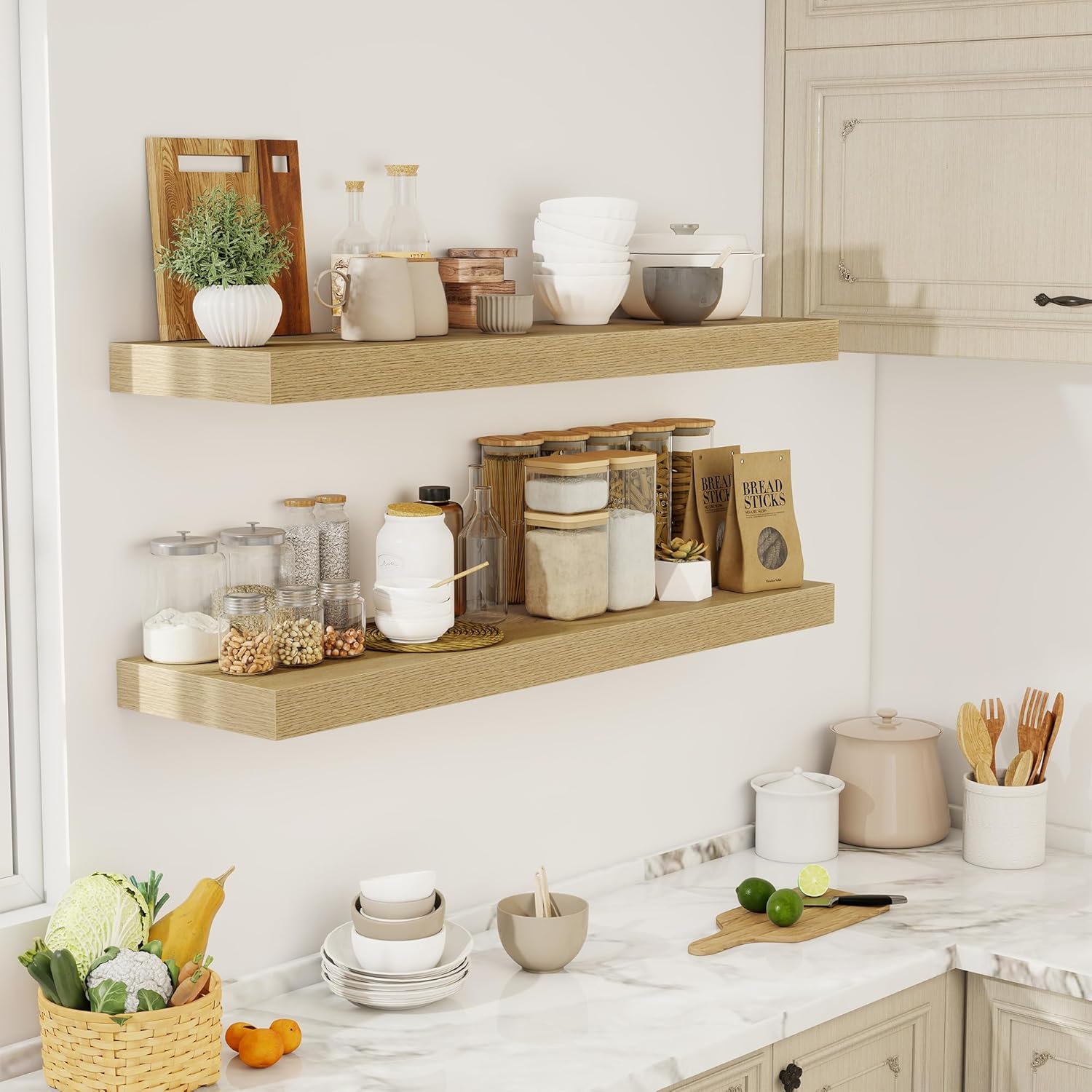 - [SPACE-SAVING WALL SOLUTION] Ideal for maximizing small rooms, kitchens, or cozy apartments, these shelves create storage without cluttering floors. Their floating design opens up living areas, making spaces feel airy and well-organized. Use them in entryways, bathrooms, or home offices to keep daily essentials neatly displayed yet within easy reach.