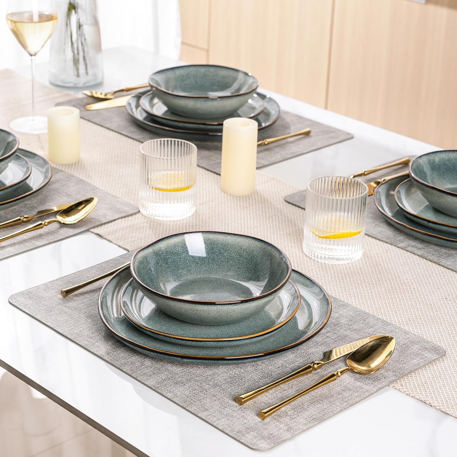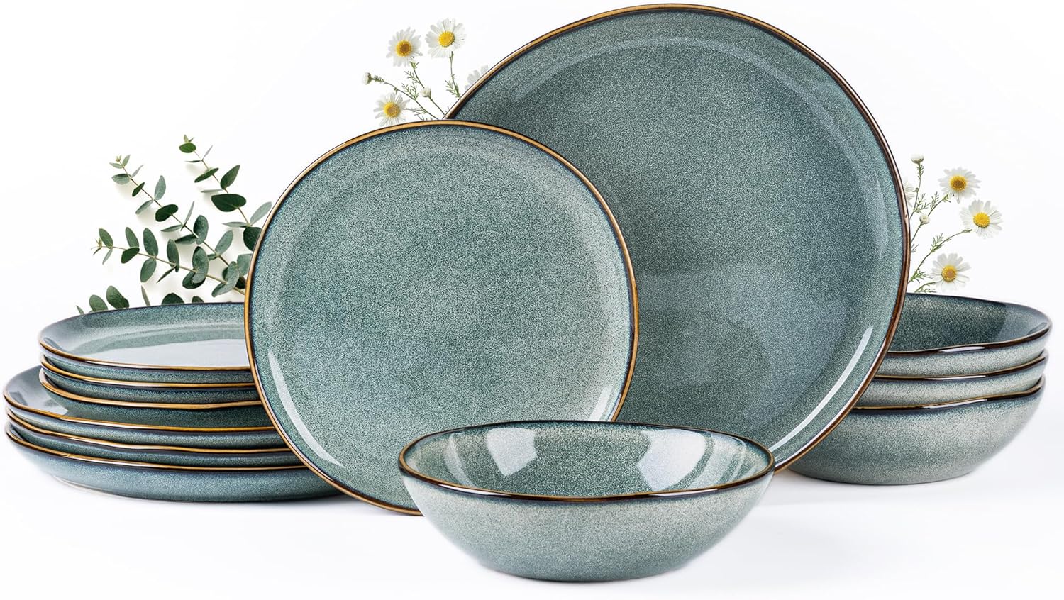 - EVERY PLATE IS UNIQUE: This dinerware set are fired with two different glazes, so the surface develops a beautiful color and makes your food look even more delicious.Since our glaze is all-natural, the surface of plates would change color on different lighting. The color may be a tad different from what you see in the images,but very item is betiful.Our glaze is also extra strong to prevent scratches from your knives and forks