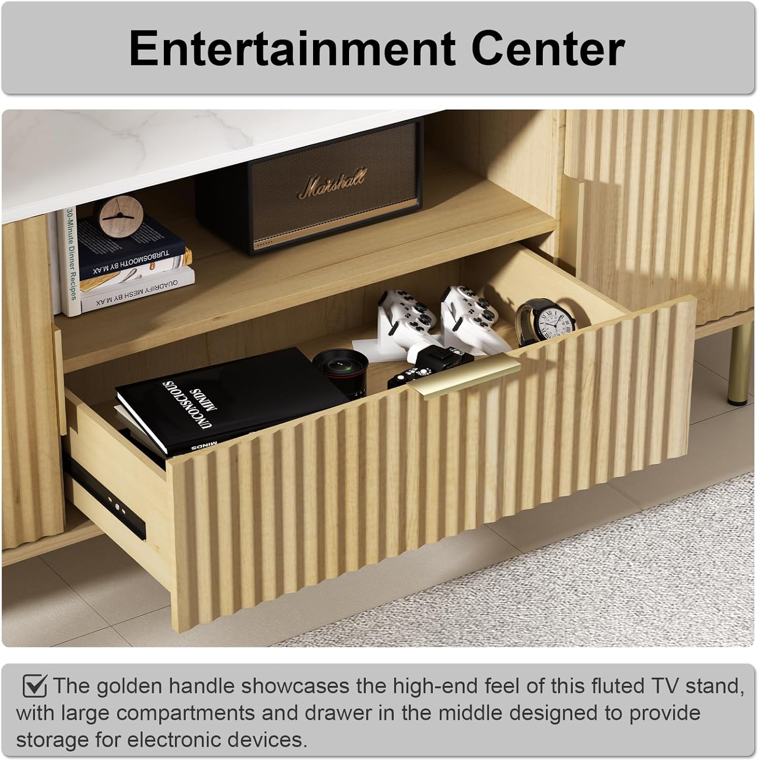 - 【Multi-functional Entertainment Center】Fluted TV Stand with Storage offers 4 independent storage spaces, allowing you to neatly organize your belongings. With a large open shelf and drawer in the middle, you can easily organize your media devices, gaming consoles, DVDs, and other accessories.