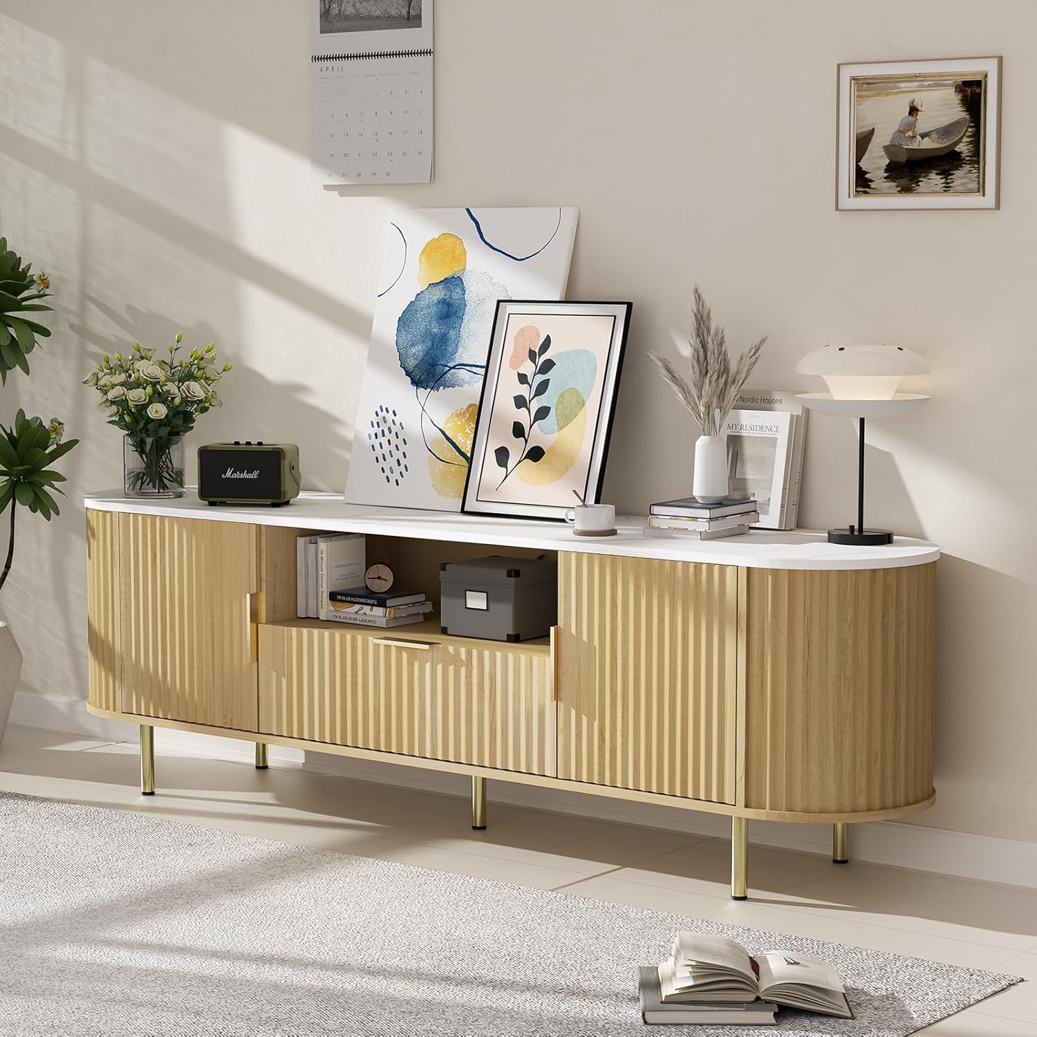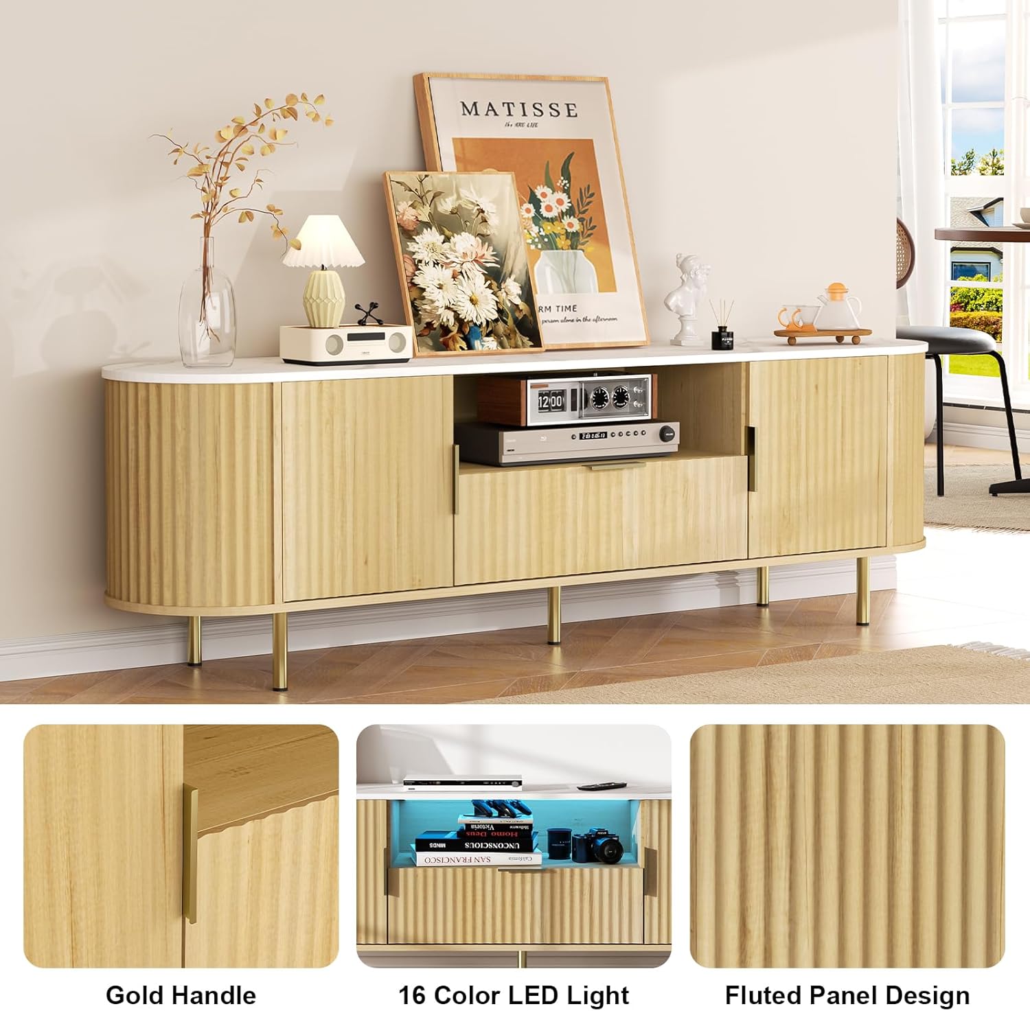 - 【Sturdy TV Console for living room】Crafted from sturdy wood, supported by 5 metal legs and frames, this living room fluted TV stand ensures durability and stability. Besides, there are large cable management holesto help keep wires organized.