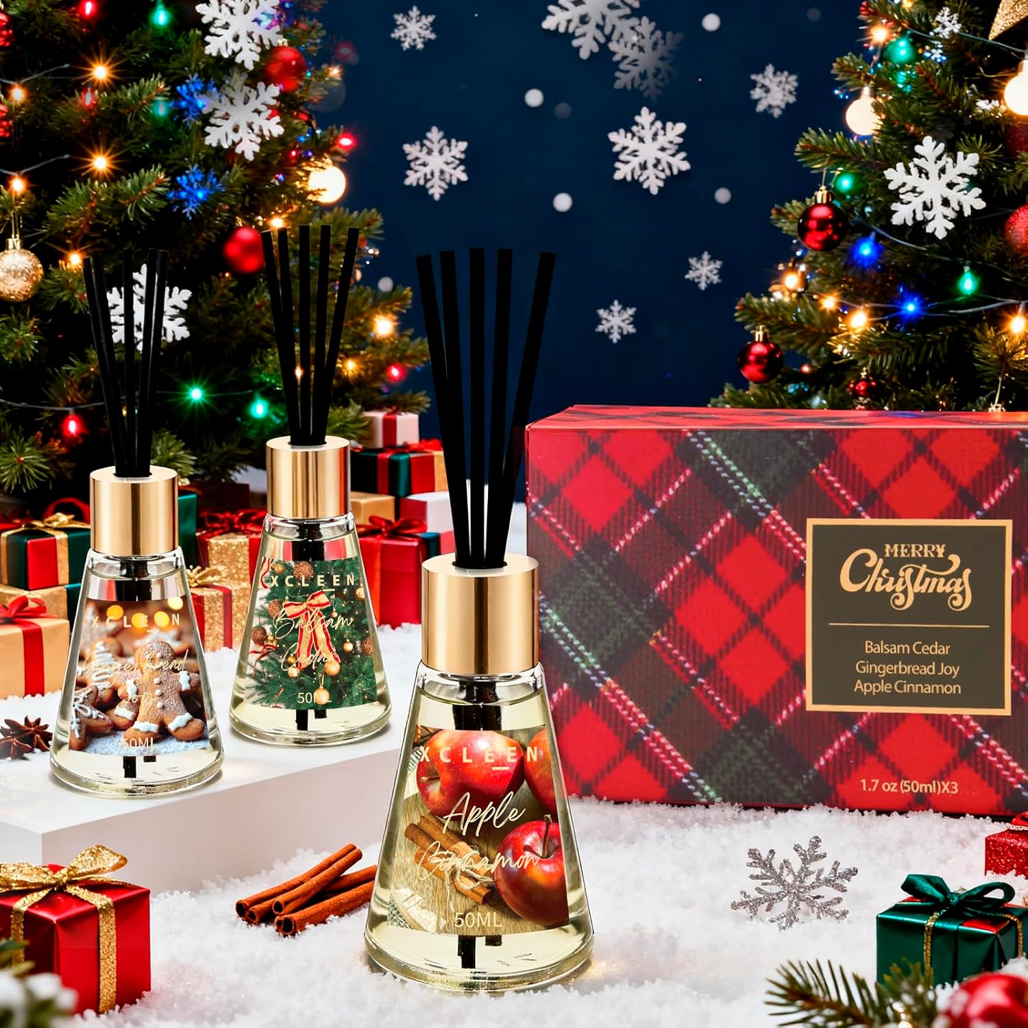 Reed Diffuser Set of 3, Scented Diffuser with Sticks, Gingerbread Joy/Apple Cinnamon/Balsam Cedar, Air Fresheners for Home Bathroom Shelf Decor, Aromatherapy Oil Diffuser Gift Idea, 1.7Oz x 3