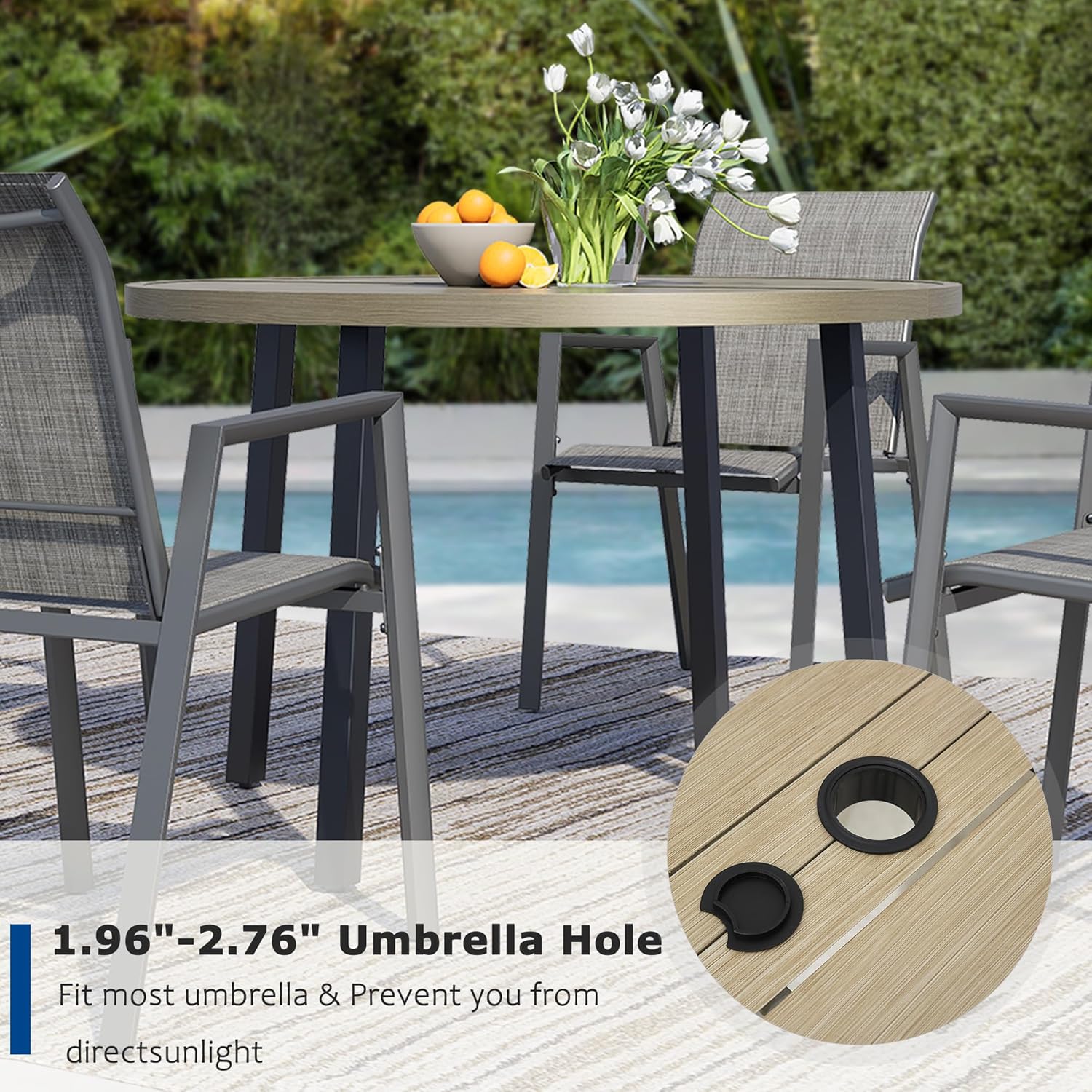 • 【Durable Round Table with Umbrella Hole】Featuring a 1.96"-2.76" adjustable umbrella hole, the sturdy patio table offers shade and UV protection, making it perfect for outdoor dining or relaxing by the pool, backyard, or deck