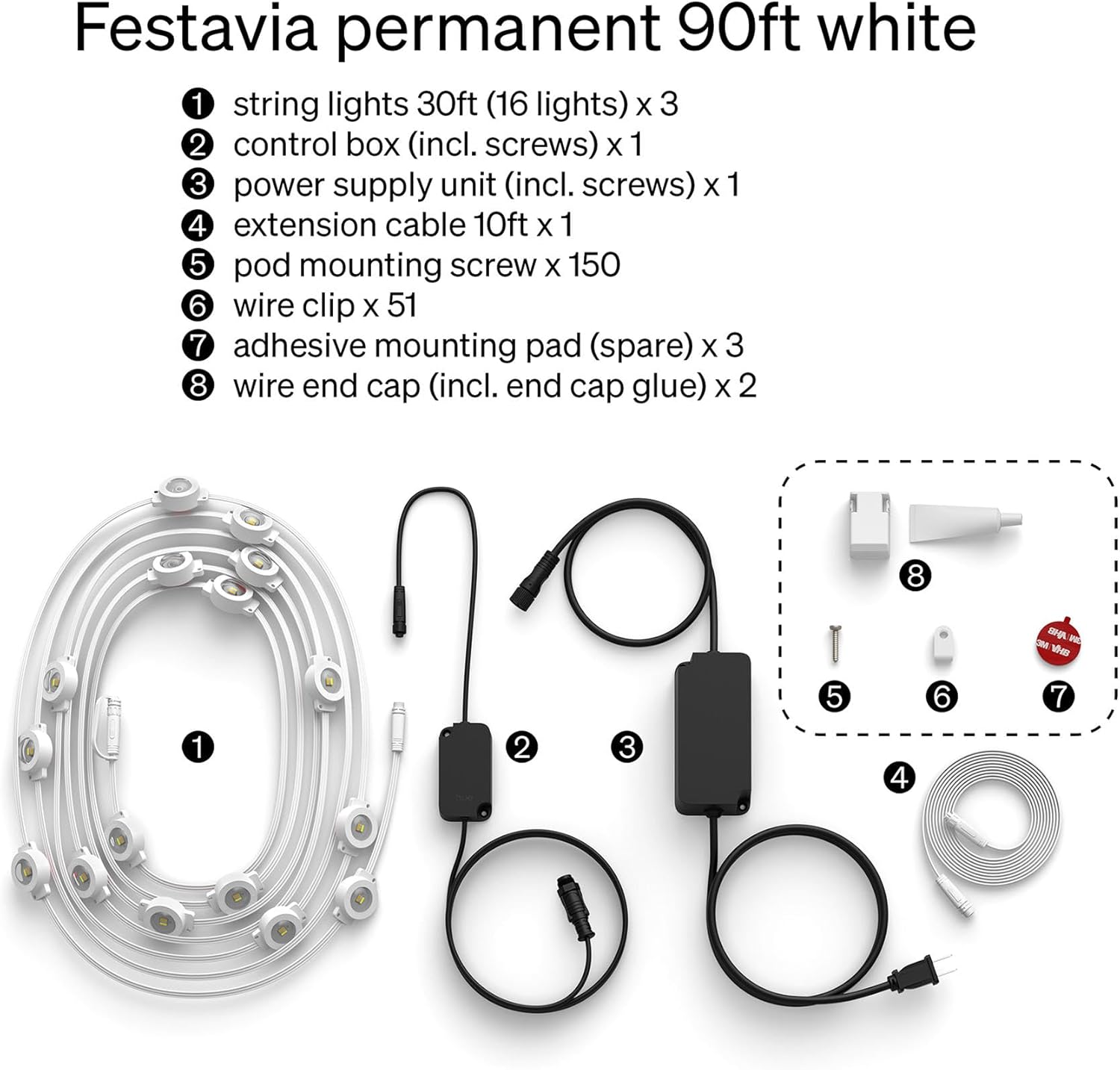 Philips Hue Festavia 90ft Permanent Outdoor String Lights, 48 Dimmable Lights, 55 Lumens Each, Weatherproof, Water-Resistant, White Wire, Color Ambience, Bridge Required