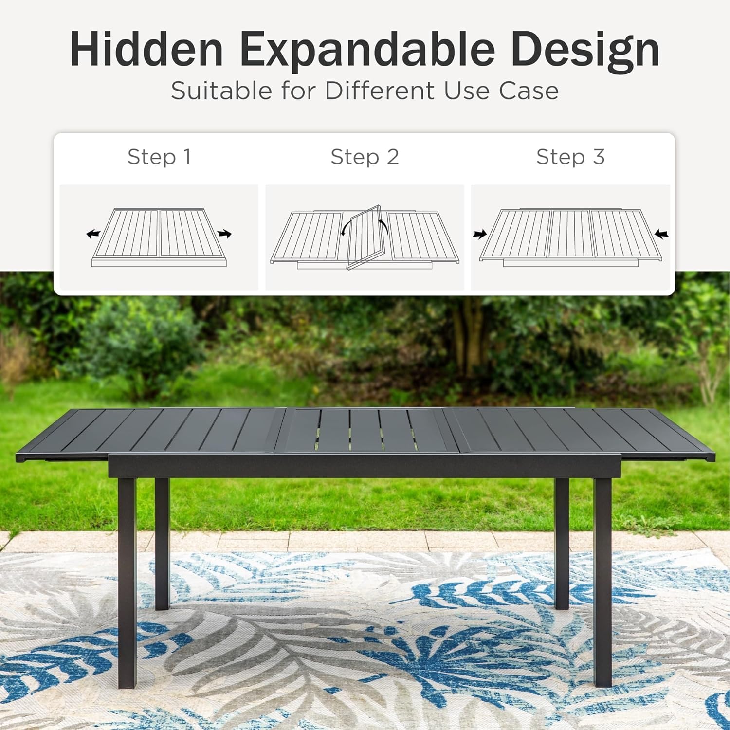 • EXTENDABLE DINING TABLE - Metal dining table with thick slat metal tabletop, rust and weather resistant. Expandable design can easily transform the table for 6 to 8 people use, convenient and useful. Skid resistant foot mats for uneven ground and against floor scratching.