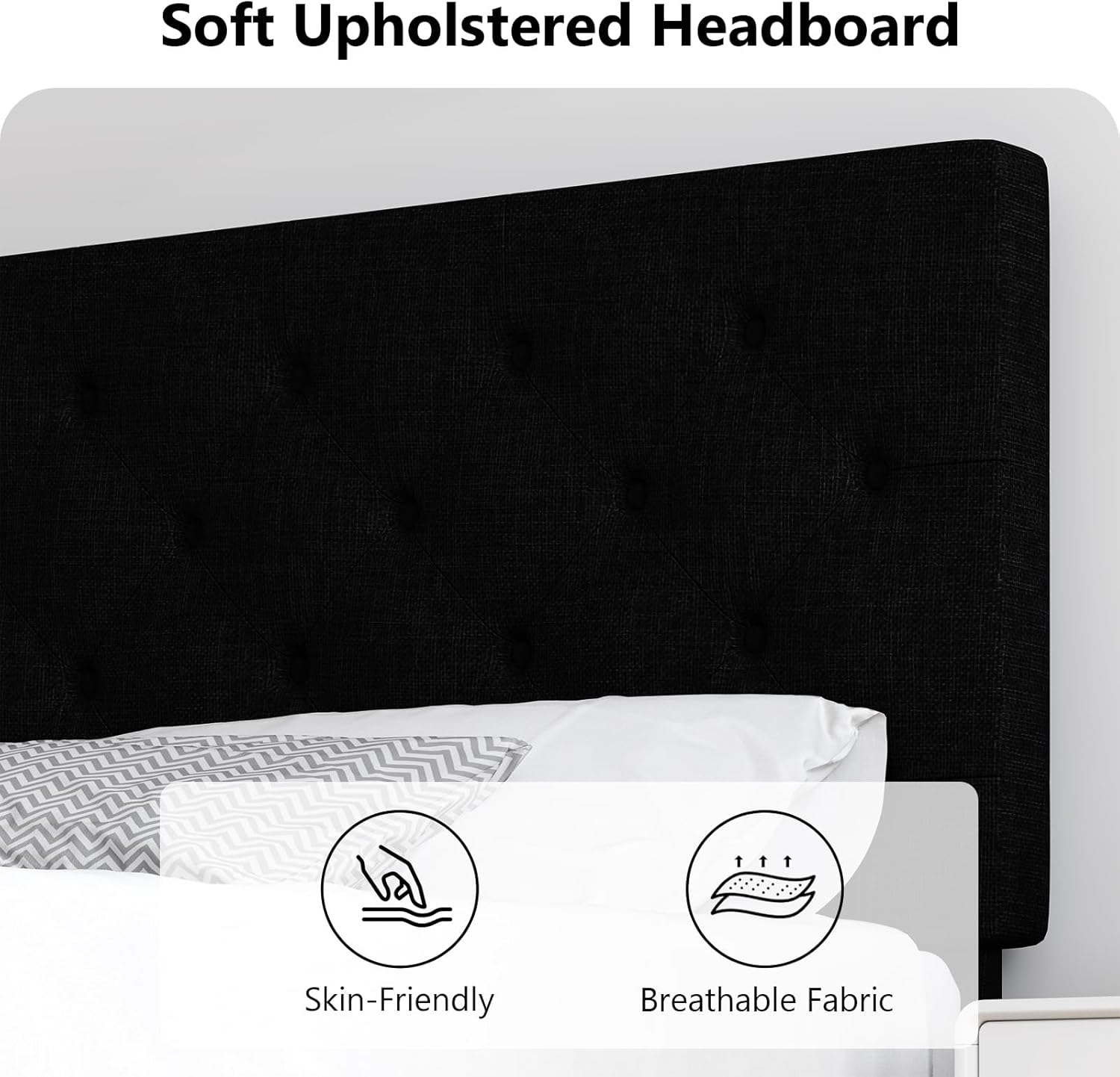 HOMBCK King Size Bed Frame with Headboard, Linen Fabric Upholstered Platform Bed Frame, Button Tufted Bed Frame King, Wooden Slat Support, No Box Spring Needed, Easy Assembly, Black