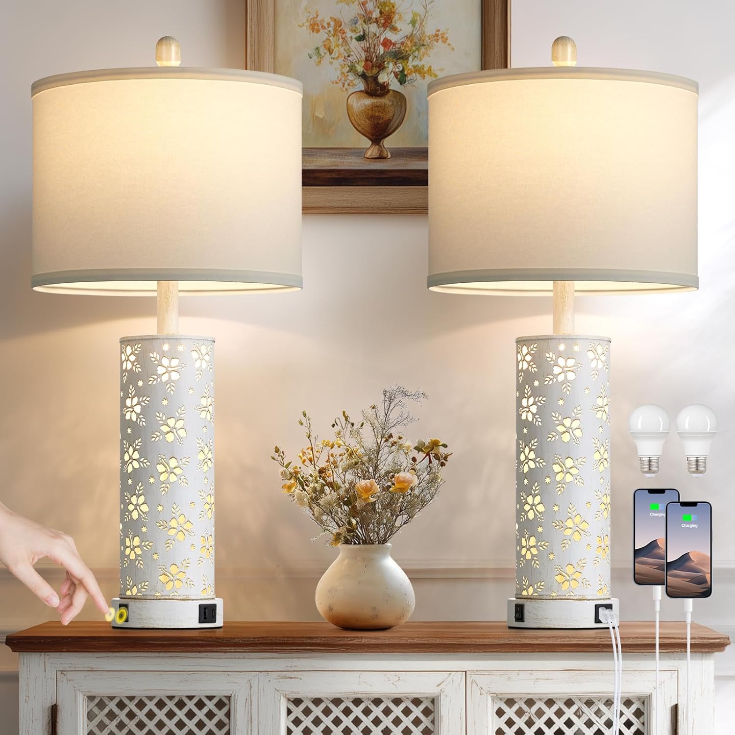 Set of 2 Rustic Table Lamps for Living Room Bedroom, Vintage Farmhouse Nightstand Lamp with 2 USB Ports, Hollow Out Metel Lamp for End Table with Nightlight (Retro White)