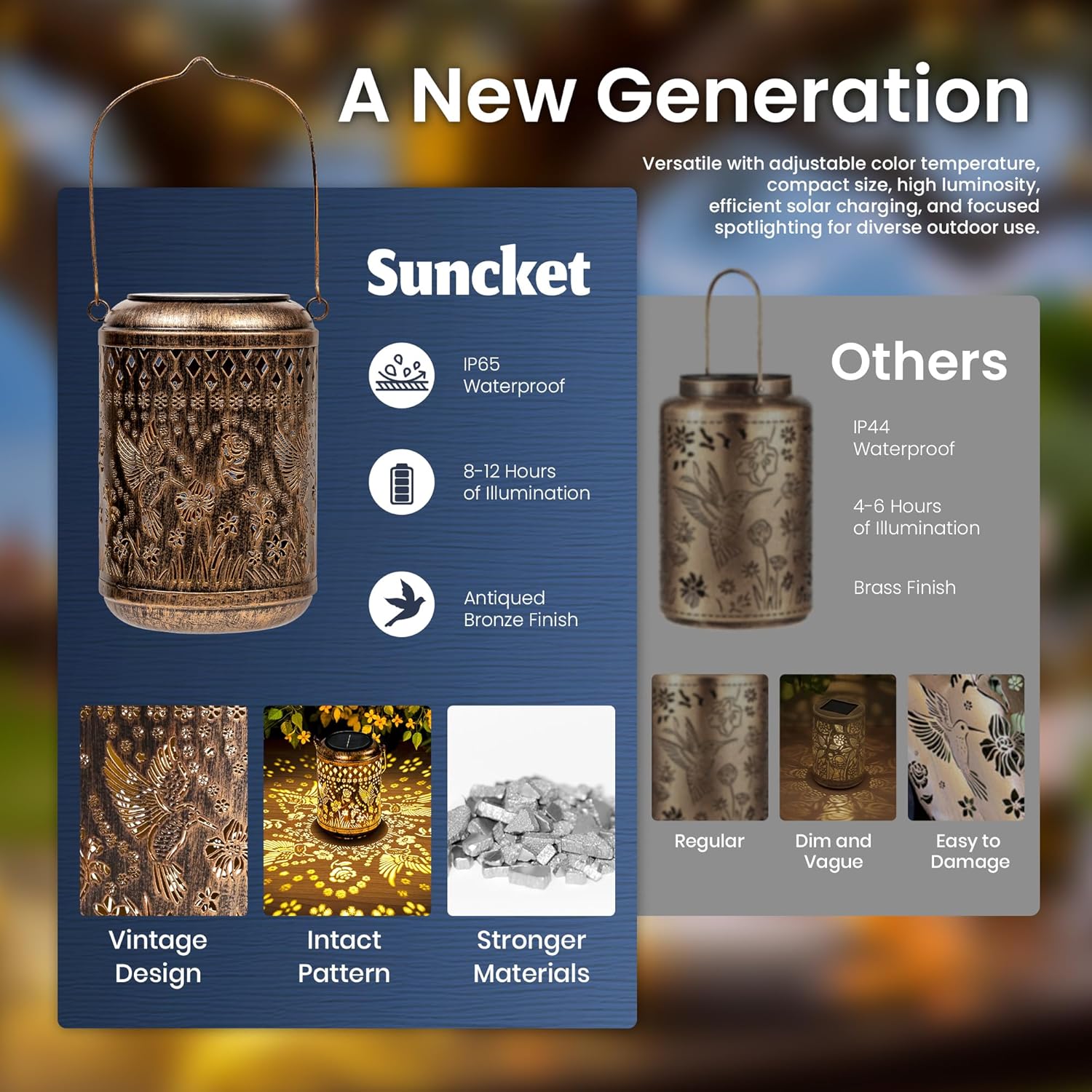 • 【Efficient Solar Powered】Hanging solar lantern is equipped with upgraded high-efficiency solar panel, collects sunlight during the day for about 6 hours, and will light up for about 8 hours at night. It automatically turns on at dusk and off at dawn.