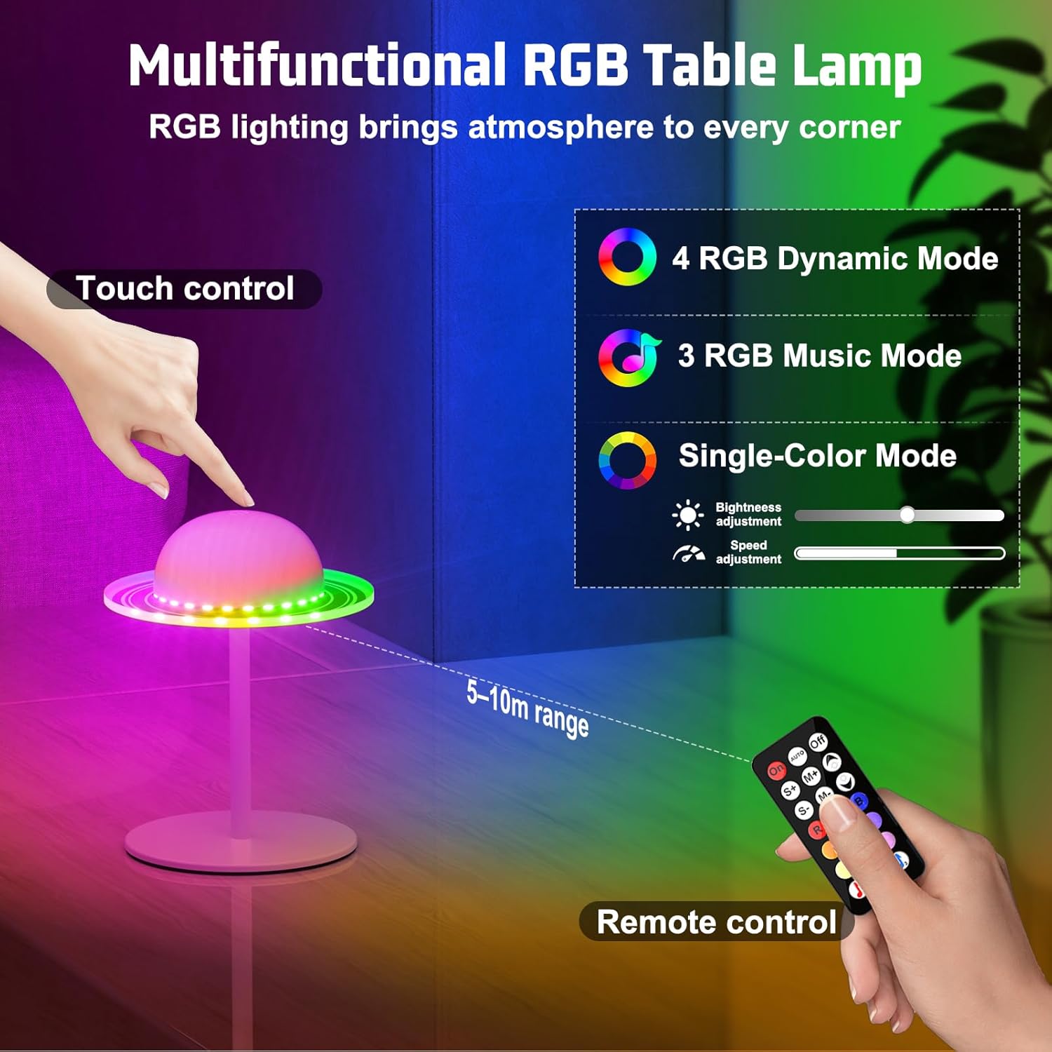 • Multi-Functional RGB Table Lamp: RGB desk lamp supports cool /natural / warm white lighting, plus 8 RGB ambient colors to match your mood. Cordless table lamp features 4 dynamic RGB and 3 music sync modes, effects like gradient, flashing, and jumping lights