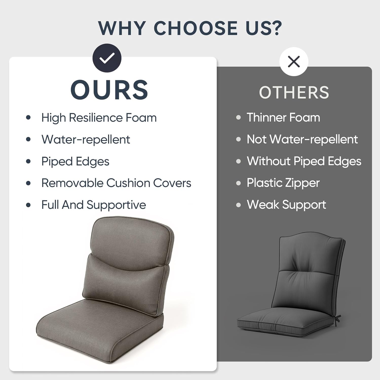 - Perfect Fit & Generous Dimensions: Achieve a custom-fit look with our patio cushion set, including 1 seat cushion (22" W x 24" D x 4" T) and 1 back cushion (22" W x 22" H x 6" T). This deep seat cushion and tall back are designed for superior comfort and support on most outdoor furniture. Pro Tip: For the perfect fit, we recommend measuring your furniture's seating area before ordering to ensure ideal coverage and a seamless look