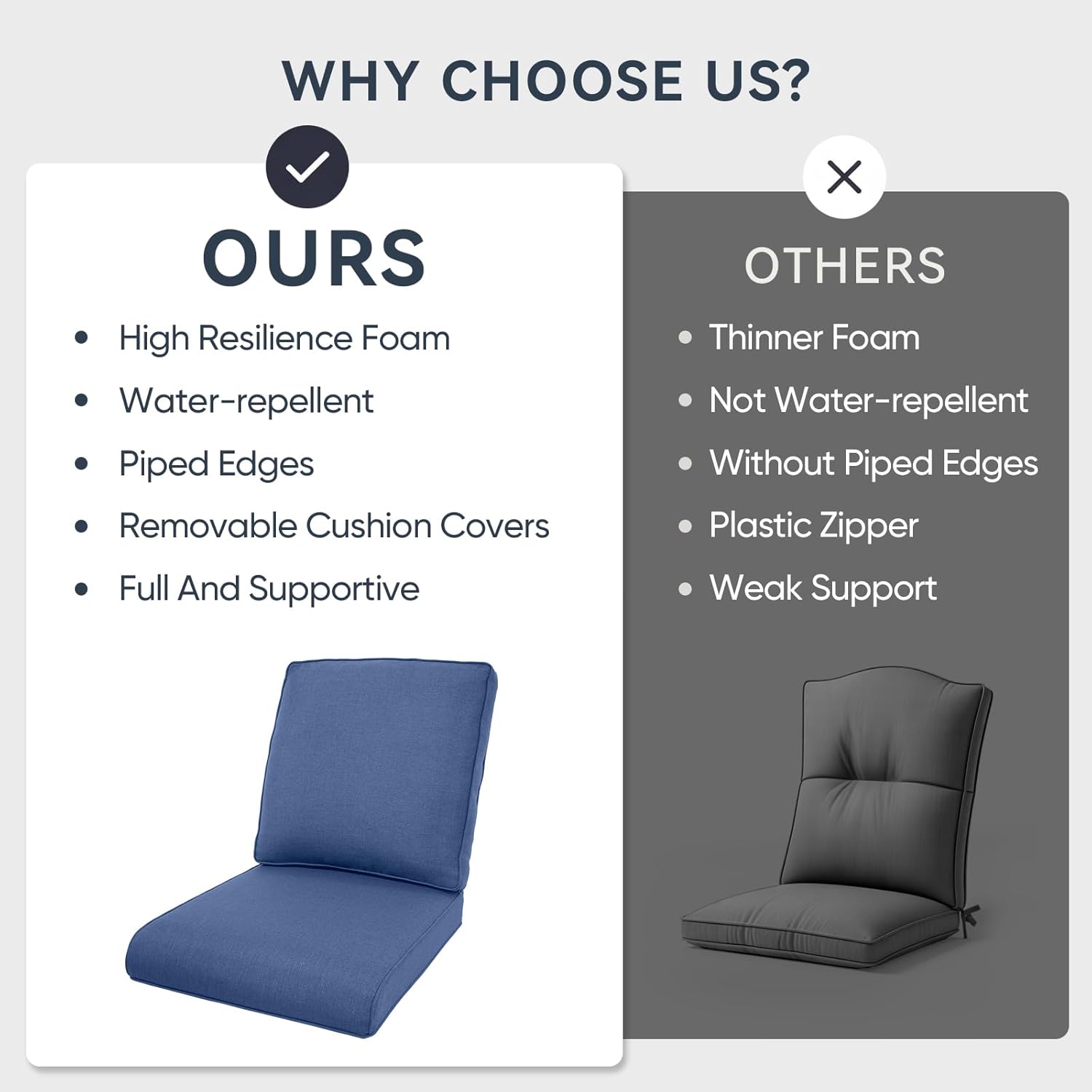 - Perfect Fit & Generous Dimensions: Achieve a custom-fit look with our patio cushion set, including 1 seat cushion (22" W x 24" D x 4" T) and 1 back cushion (22" W x 22" H x 6" T). This deep seat cushion and tall back are designed for superior comfort and support on most outdoor furniture. Pro Tip: For the perfect fit, we recommend measuring your furniture's seating area before ordering to ensure ideal coverage and a seamless look