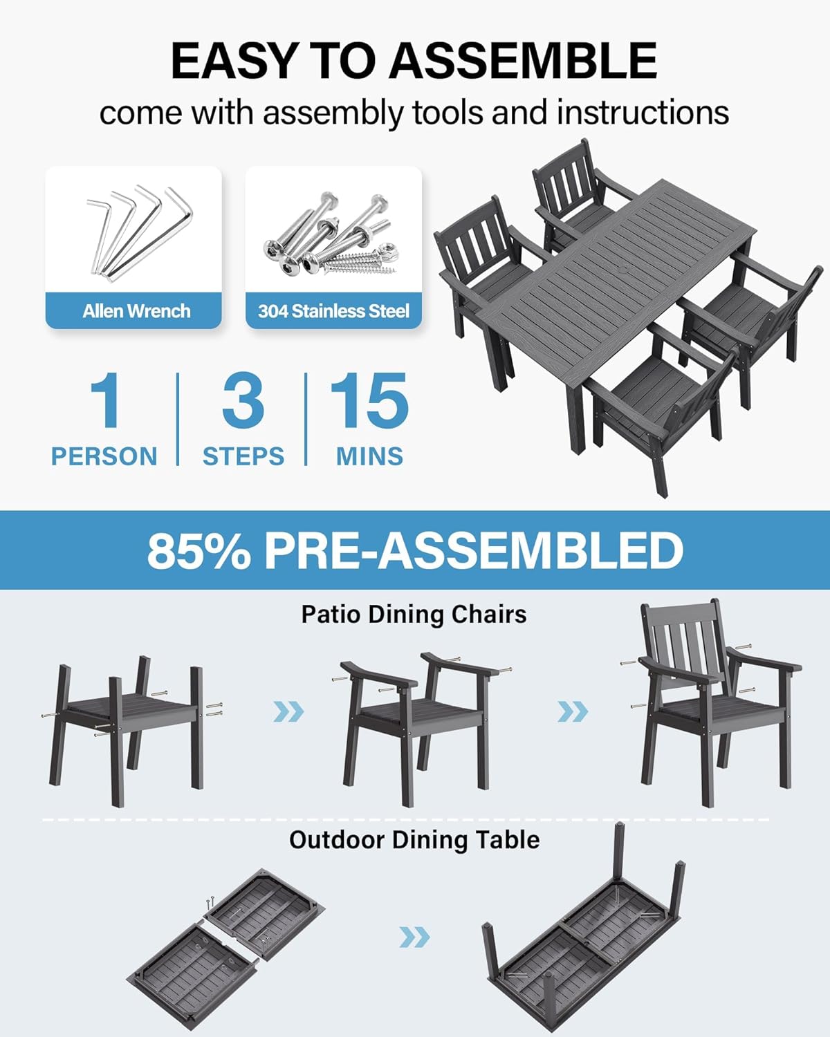 - Easy Assembly and 85% Pre-Assembled Dining Chairs: YEFU outdoor dining chairs have all necessary tools (allen wrench, 304 stainless steel screws) and clear installation instructions. 85% pre assembed, each dining chair require only 1 person, 10 mins to complete, allowing you to quickly set up your dining area, decorate the patio, and enjoy the fun of outdoor dining